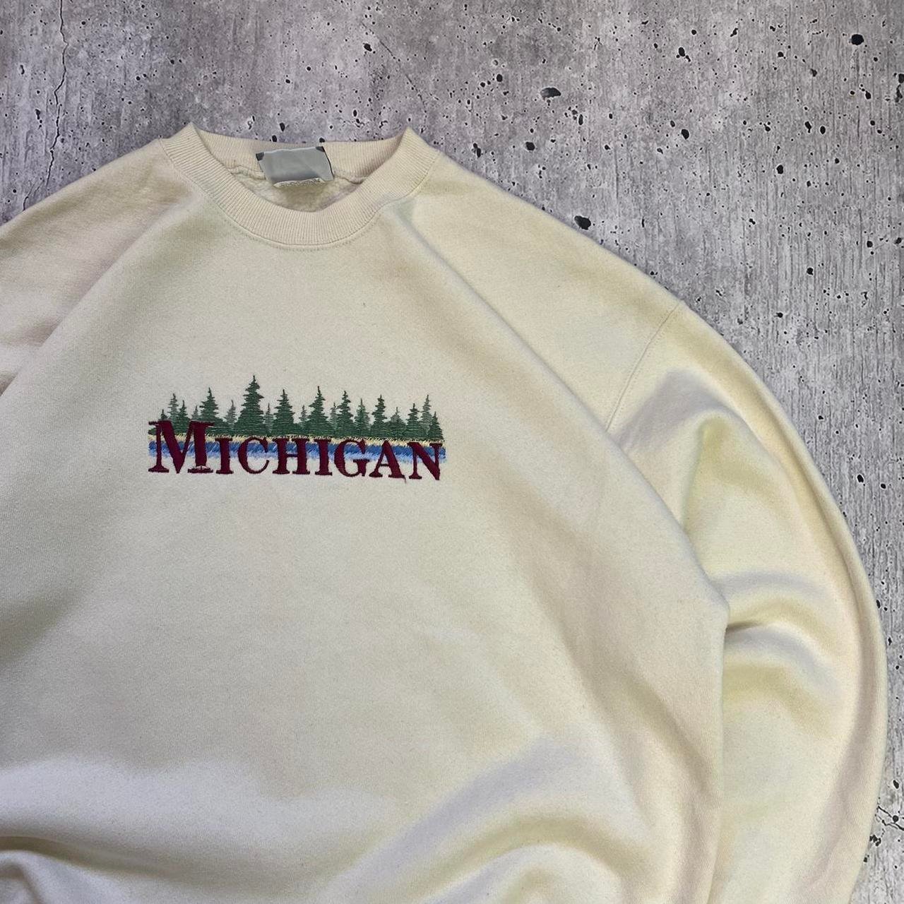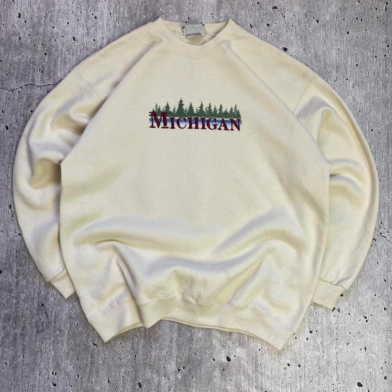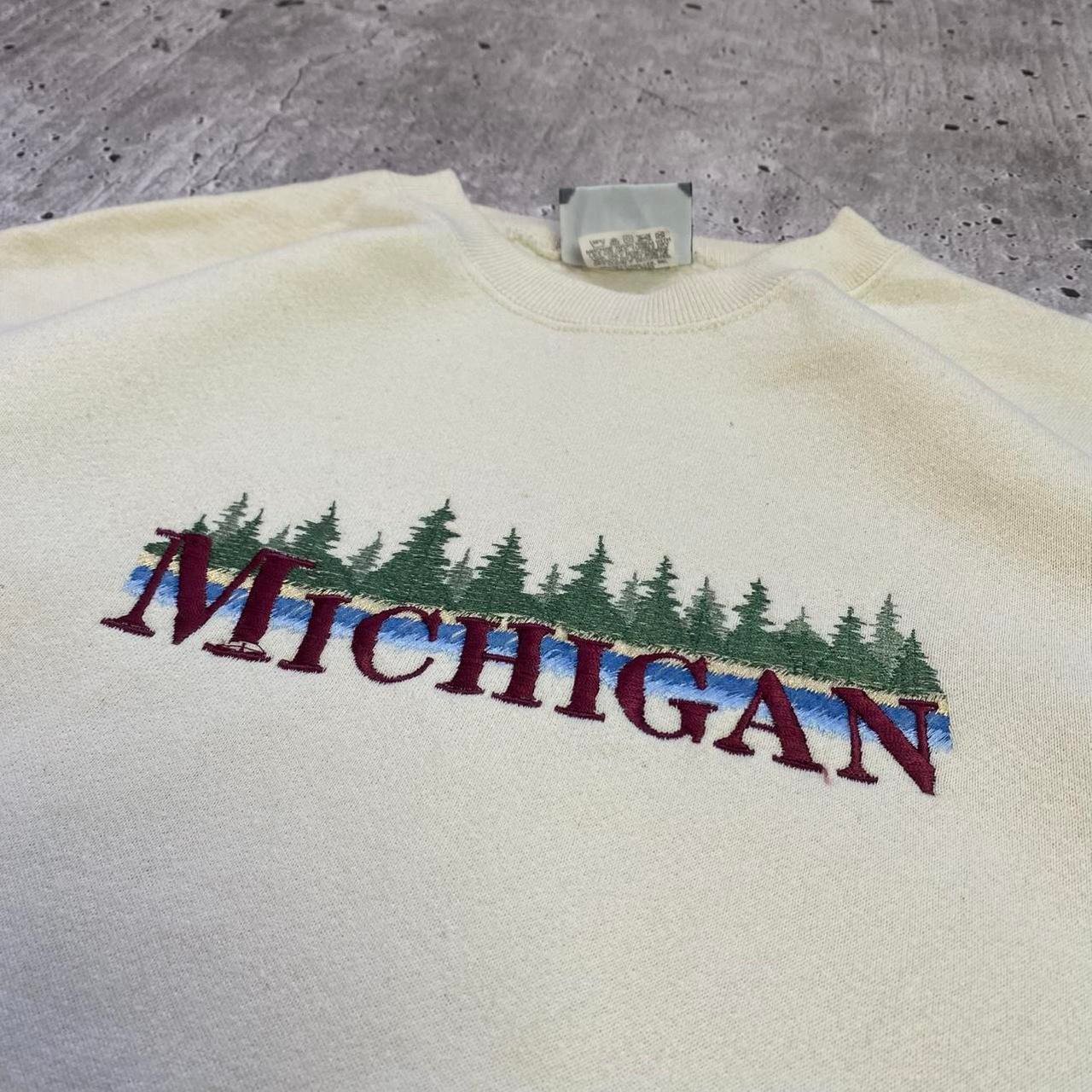 Vintage 90s cream Lee American souvenir sweatshirt with large embroidered Michigan graphic across front.