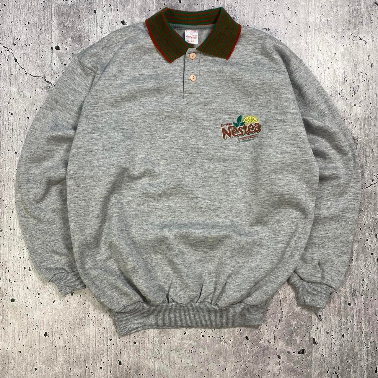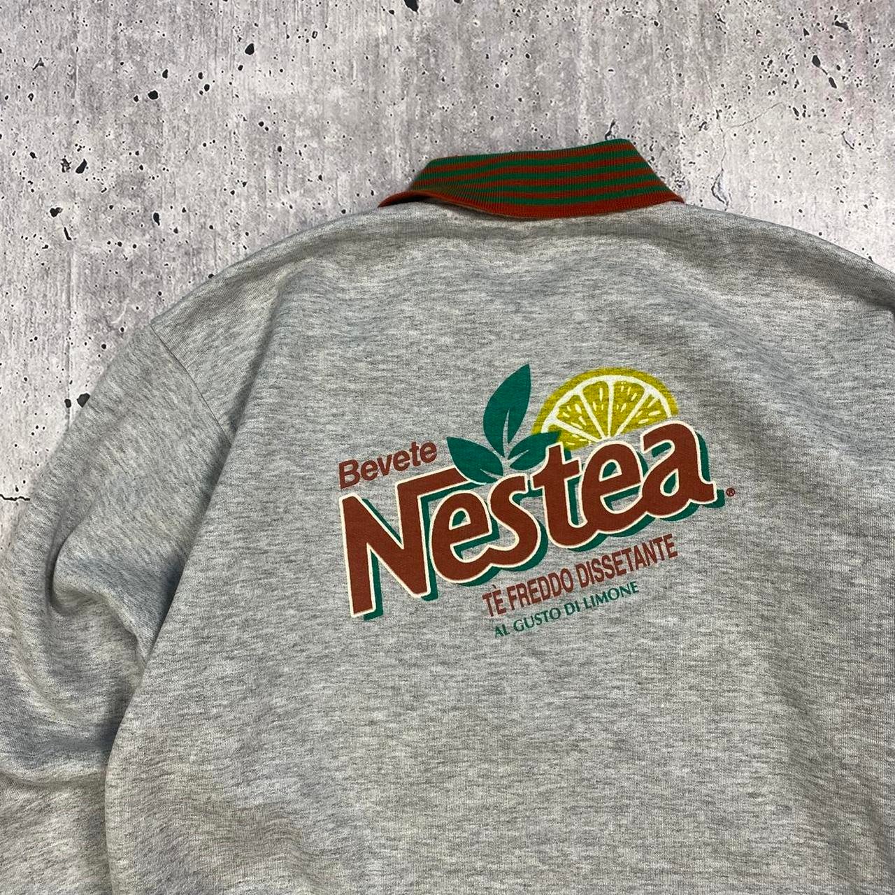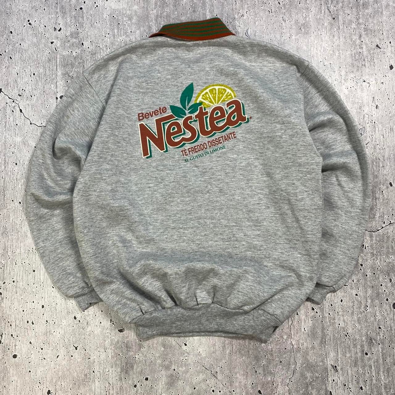 Vintage 90s grey Nestea drink graphic sweatshirt with large printed Nestea Ice Tea drink graphic on reverse and front.