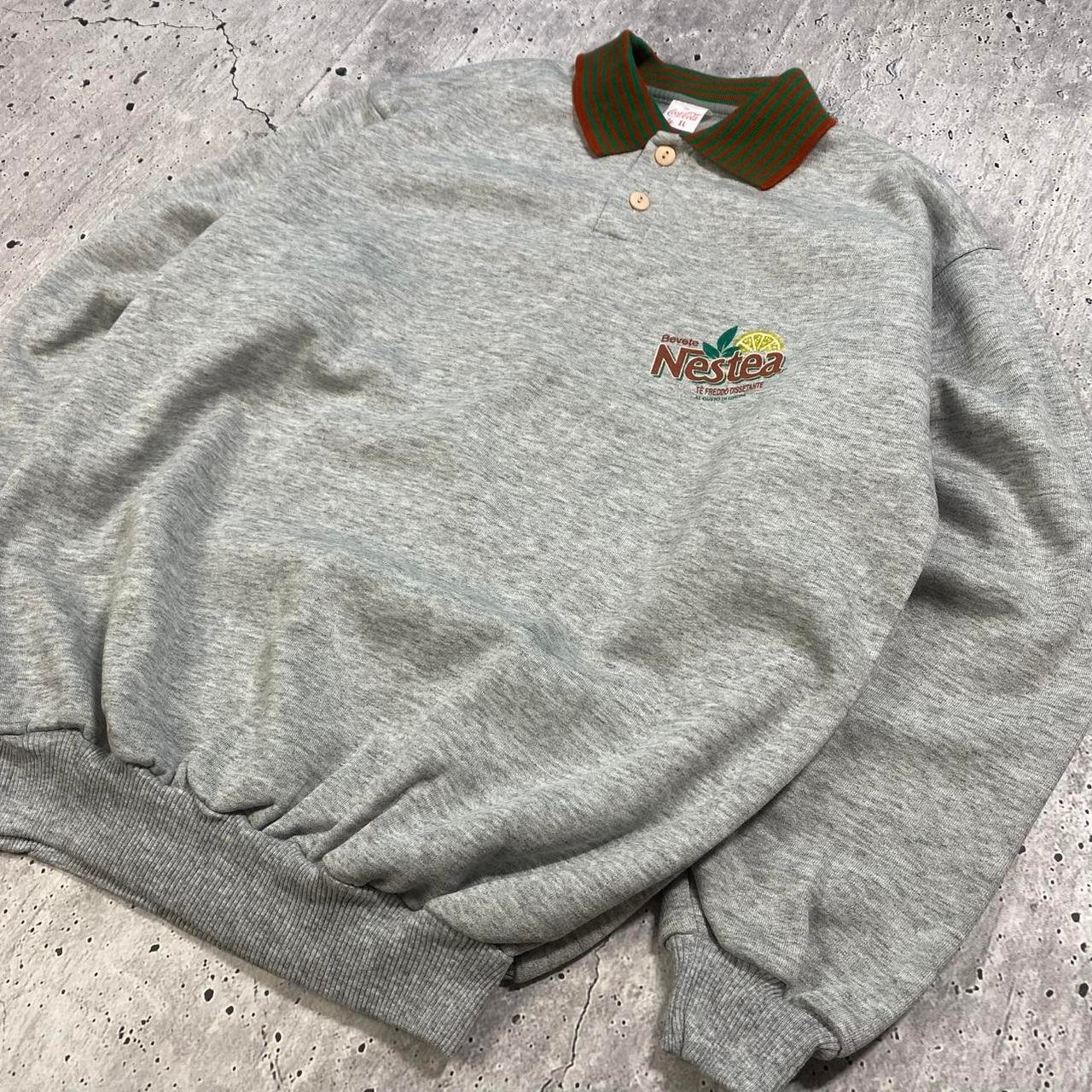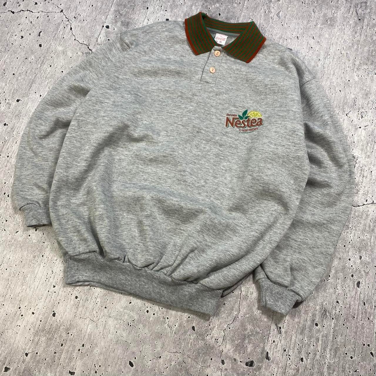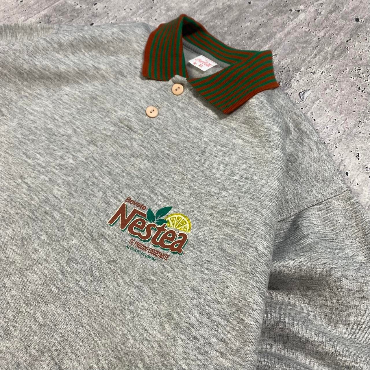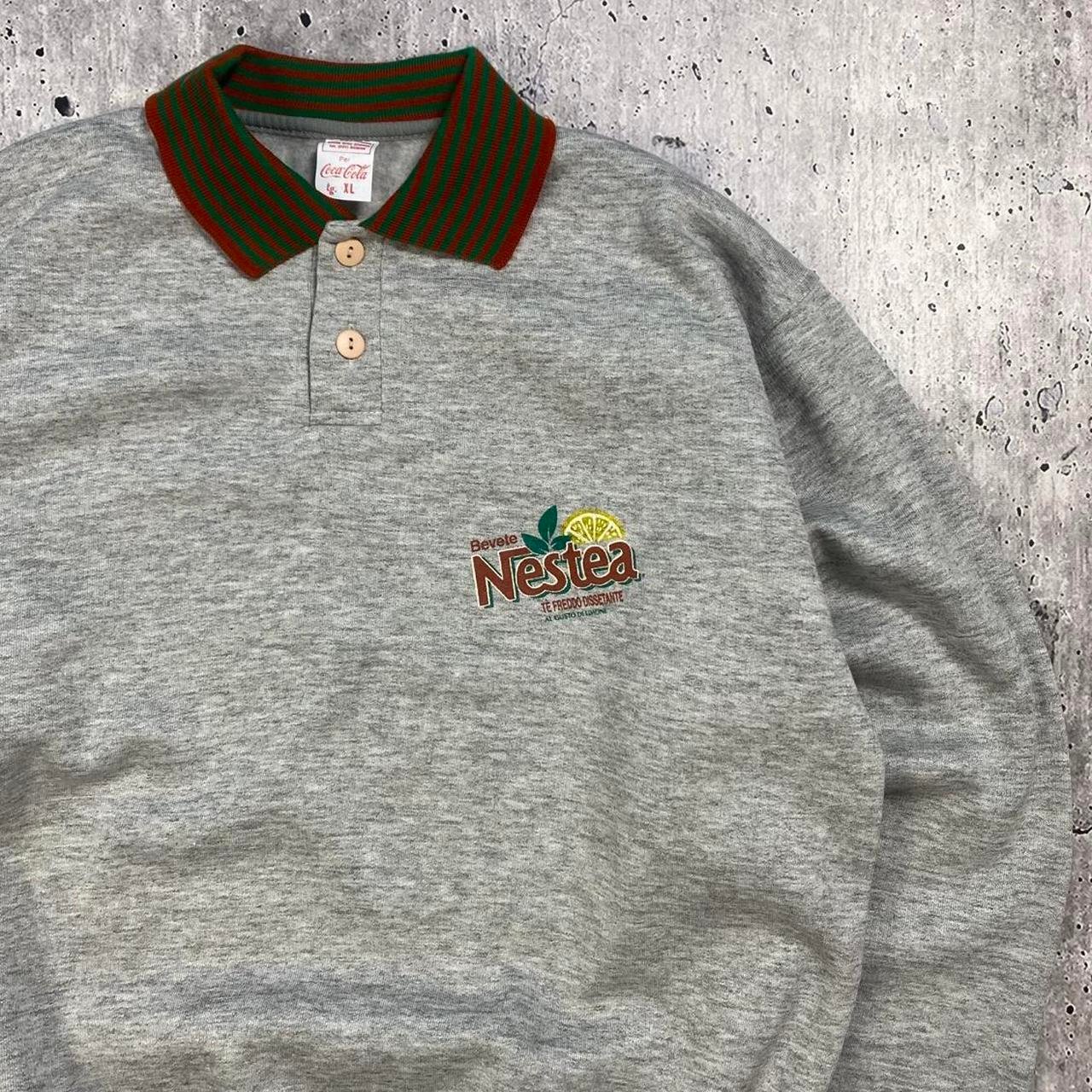 Vintage 90s grey Nestea drink graphic sweatshirt with large printed Nestea Ice Tea drink graphic on reverse and front.