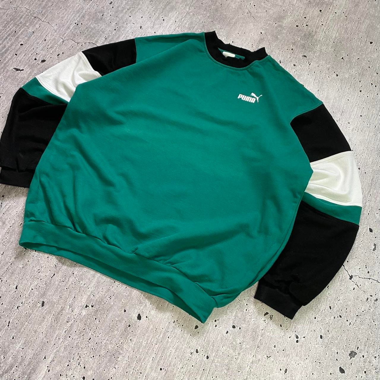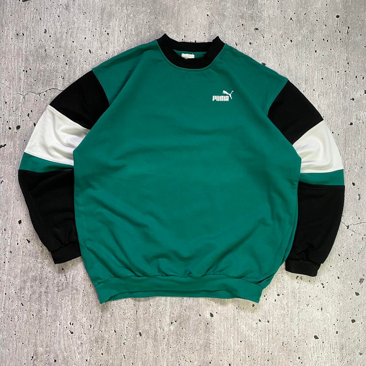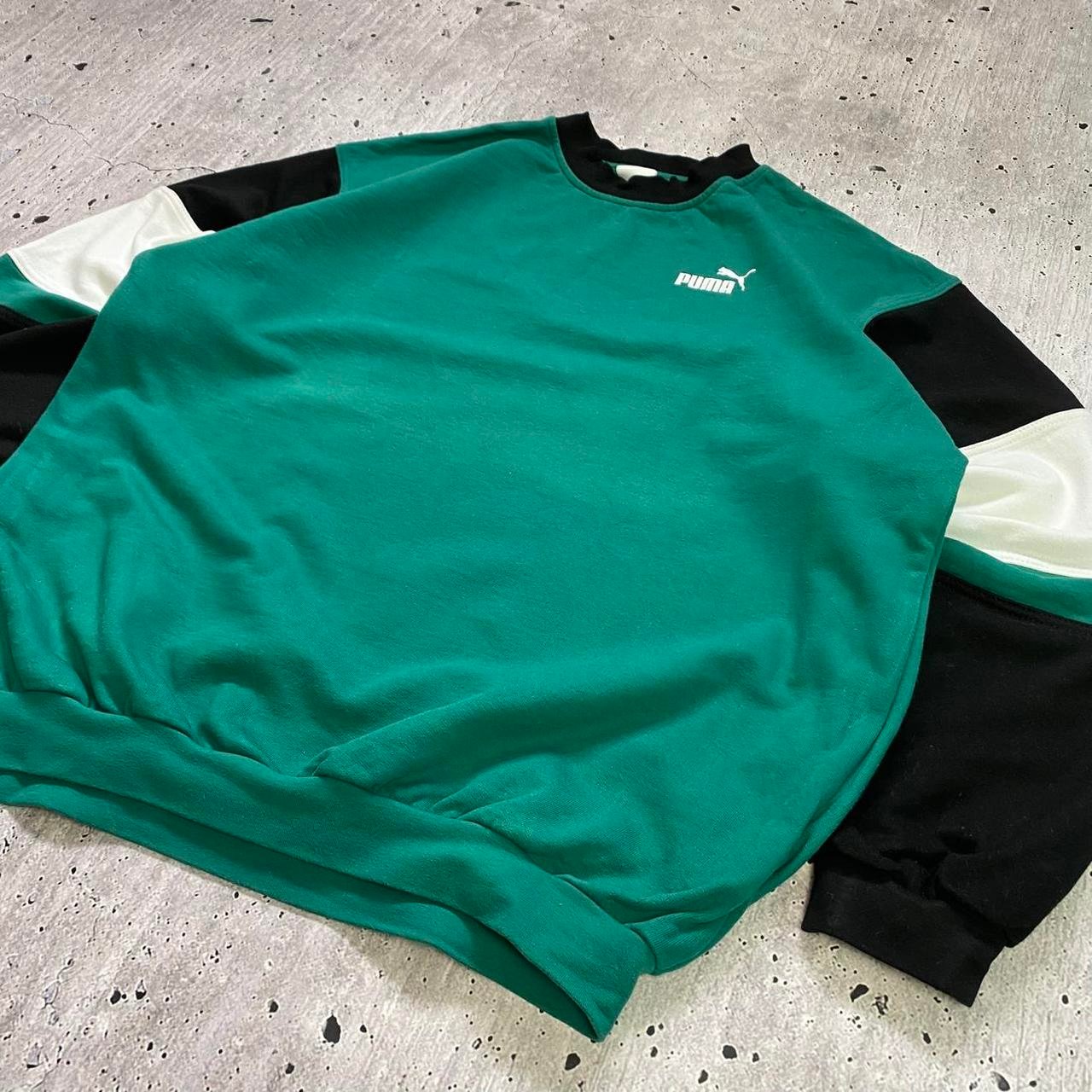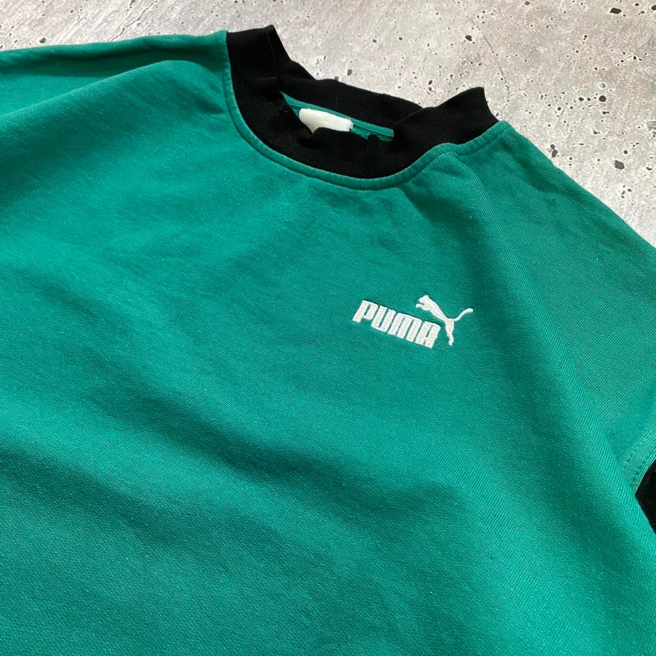 Vintage 90s green Puma sweatshirt with embroidered Puma logo on chest. Retro colourway. Heavyweight quality sweatshirt.