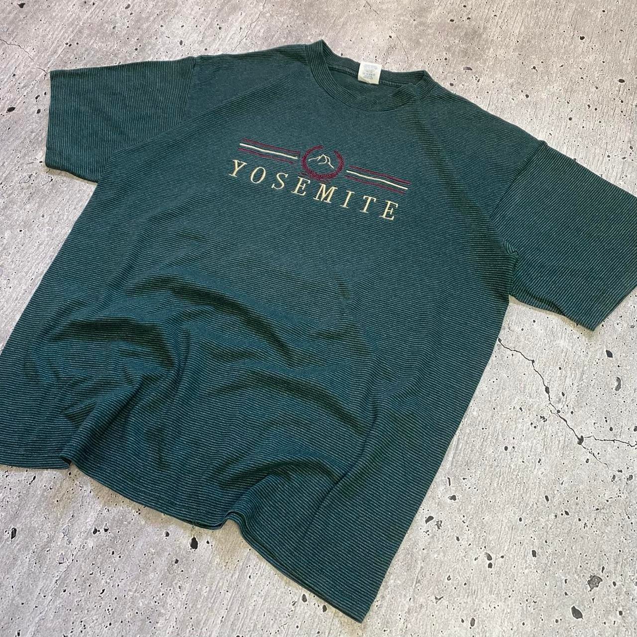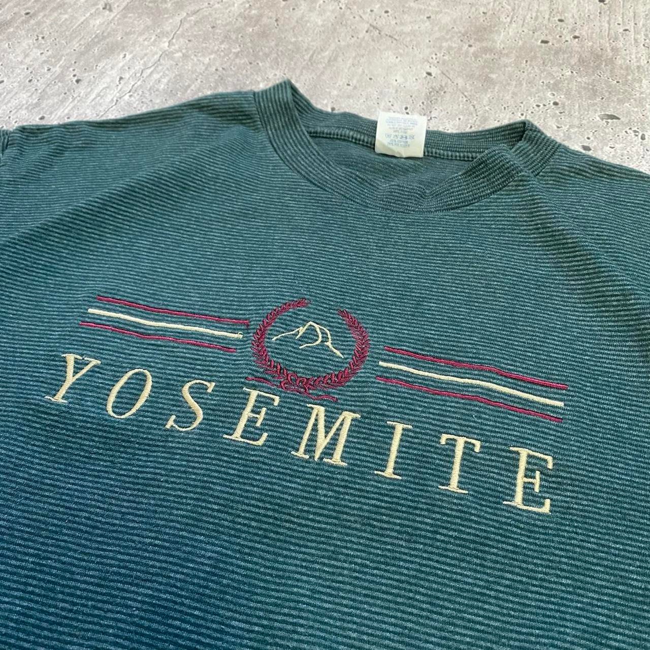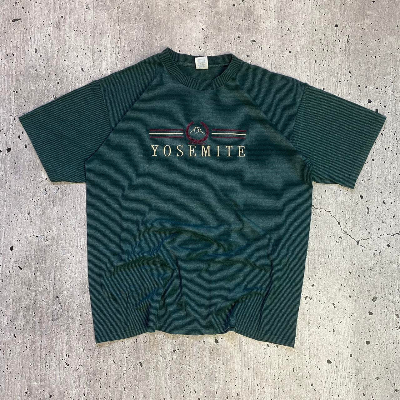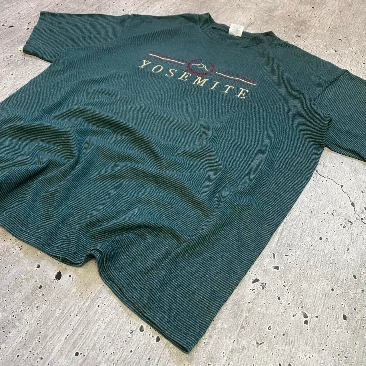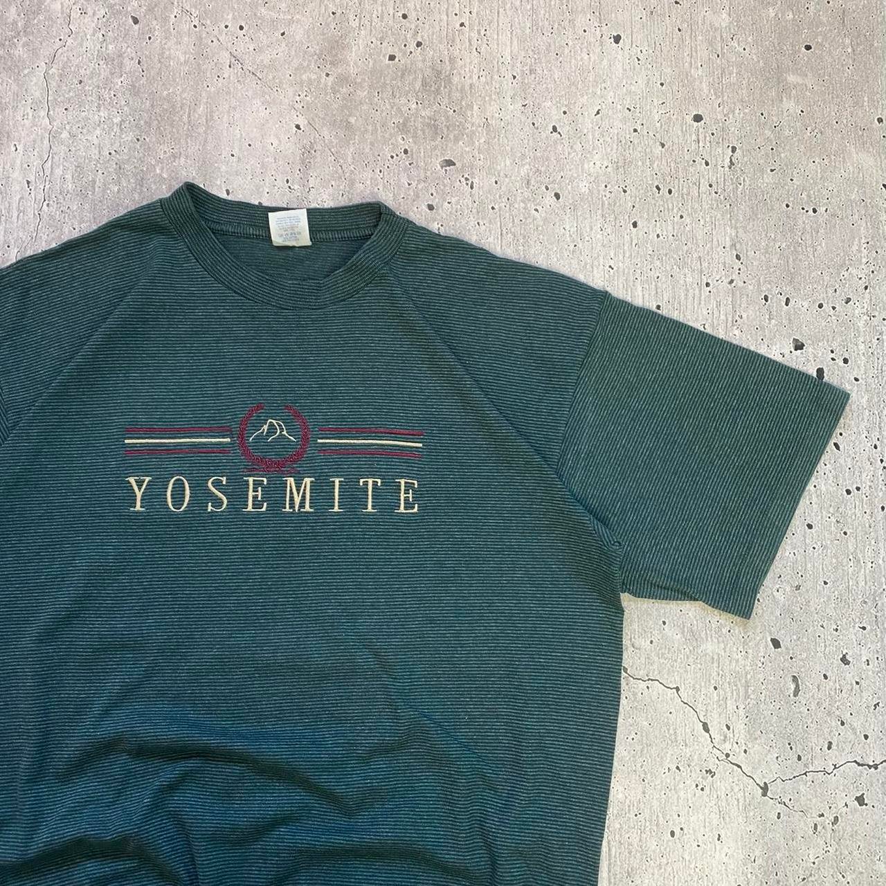 Vintage 90s green American souvenir single stitch t-shirt with large embroidered Yosemite graphic across front.