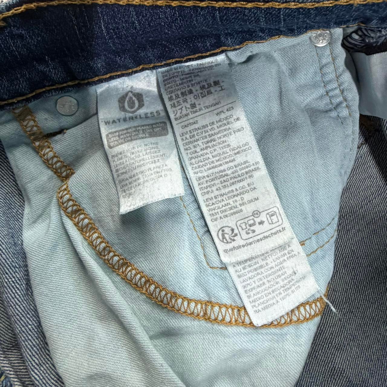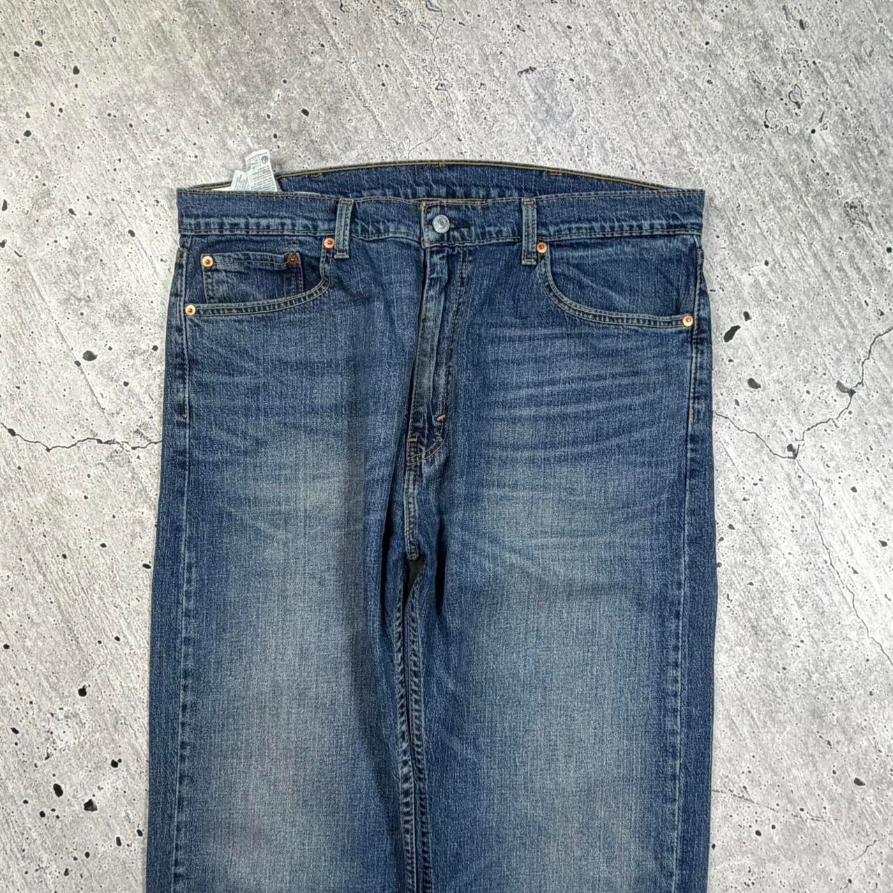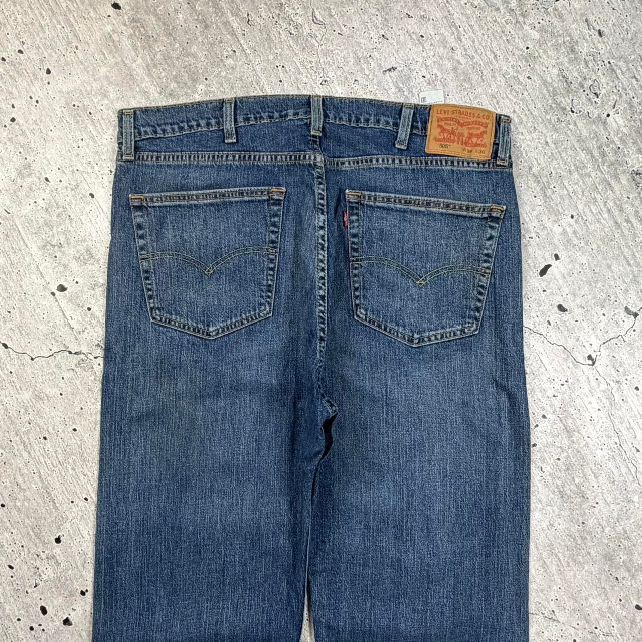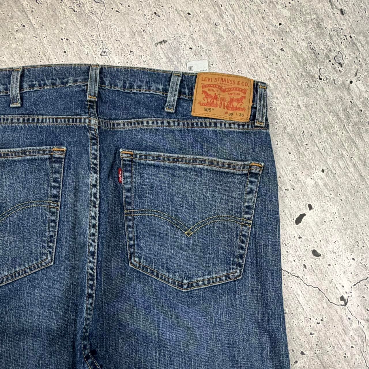 Blue straight leg Levi’s jeans with classic leather Levi’s logo patch on reverse.