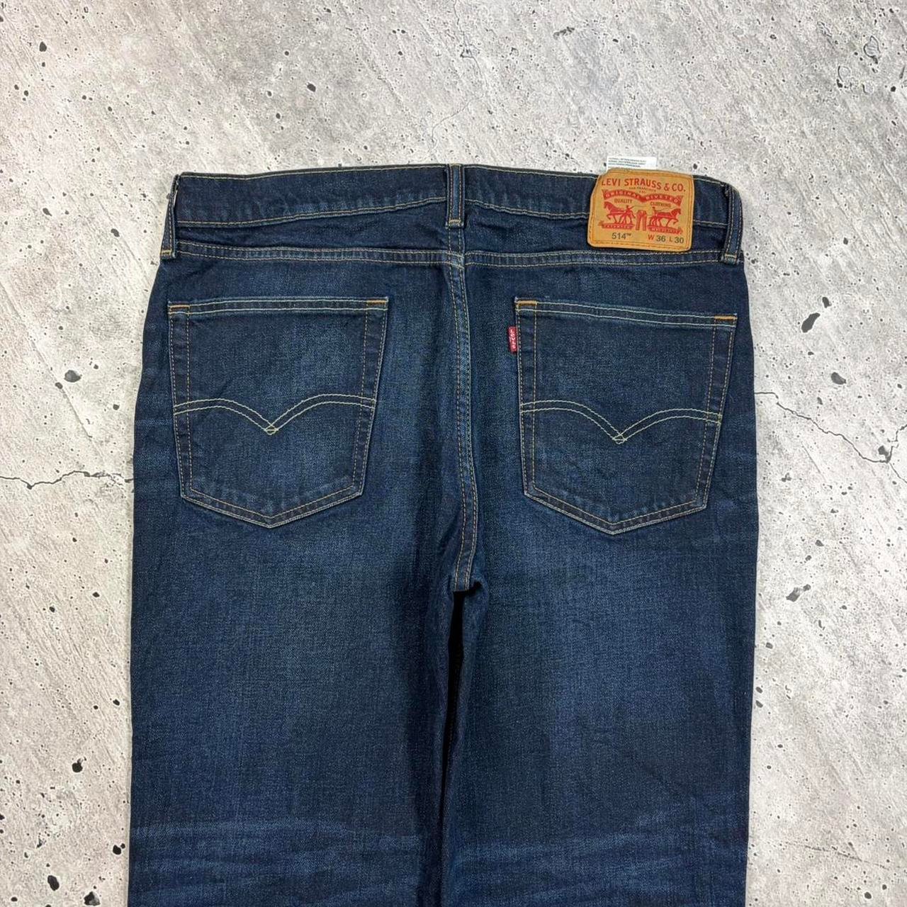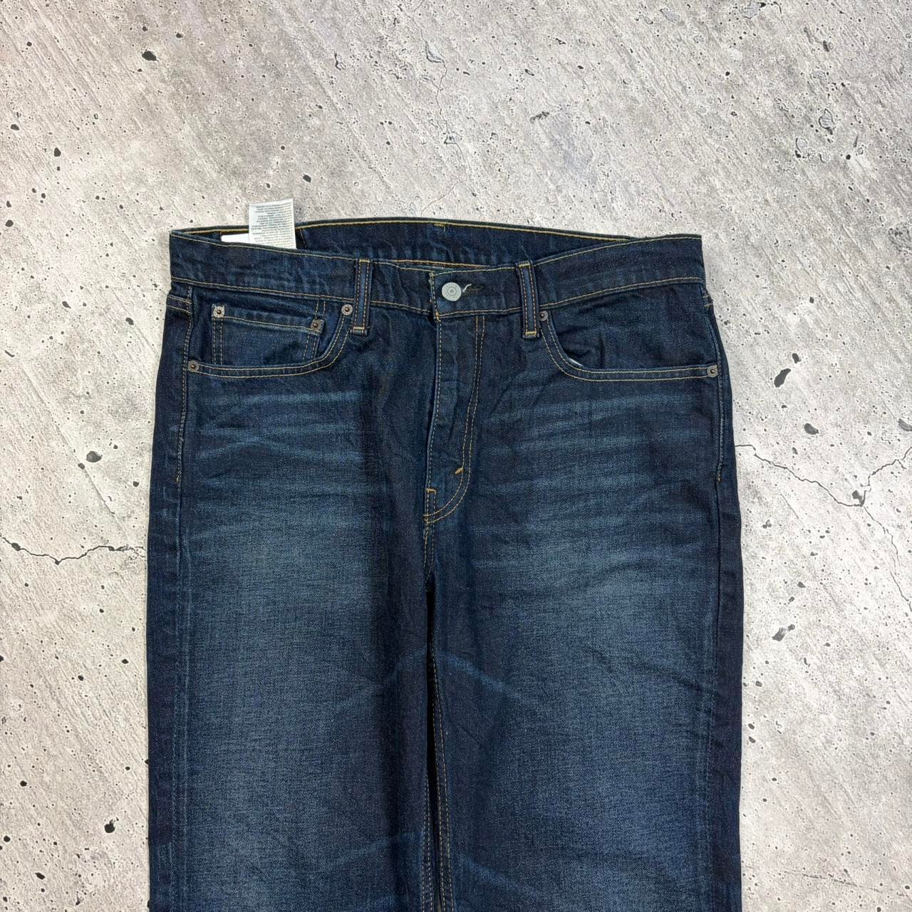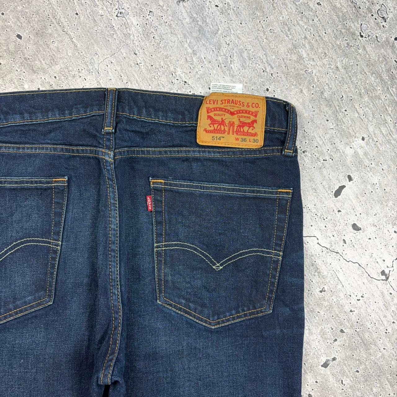 Dark blue straight leg Levi’s jeans with classic leather Levi’s logo patch on reverse.