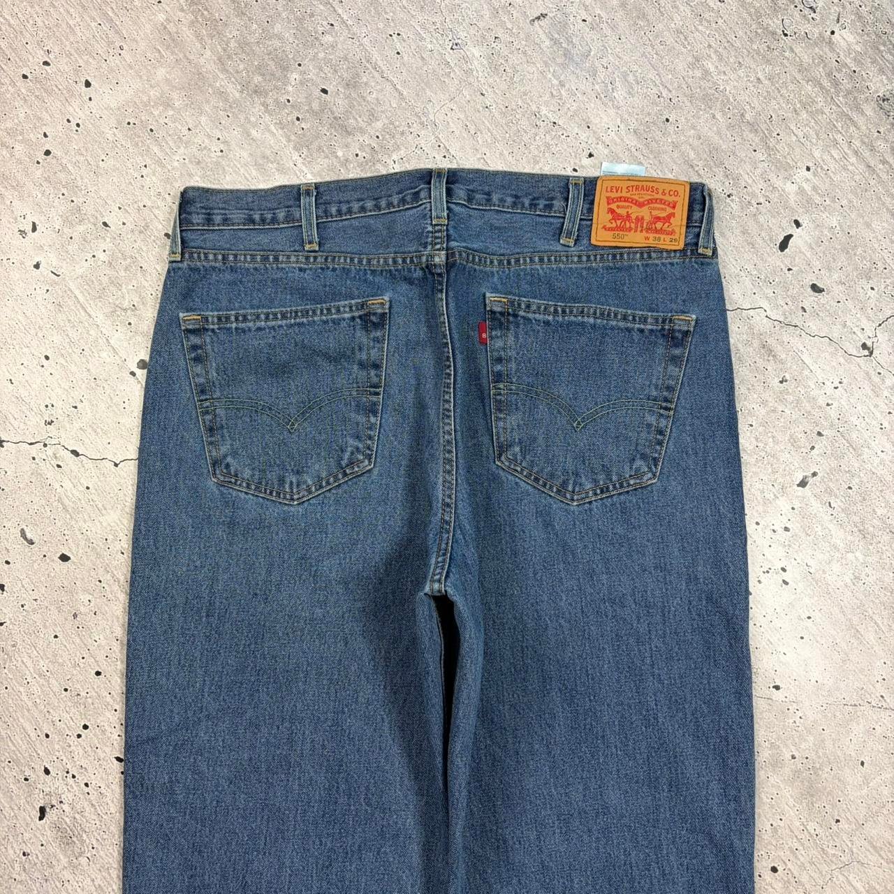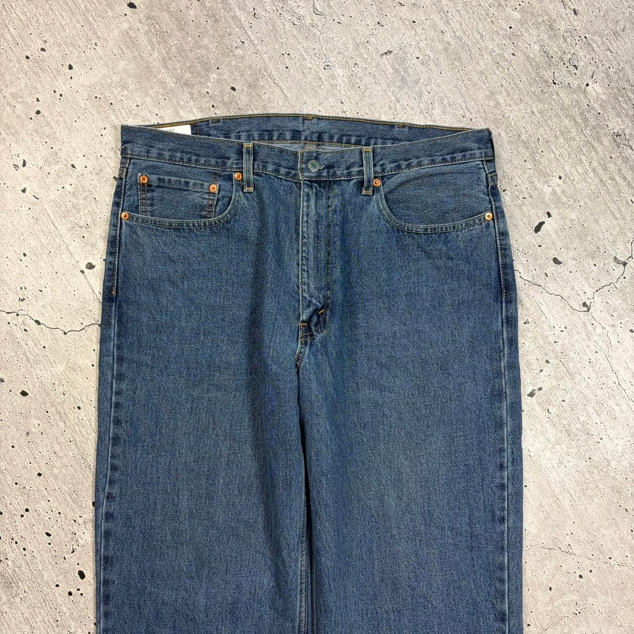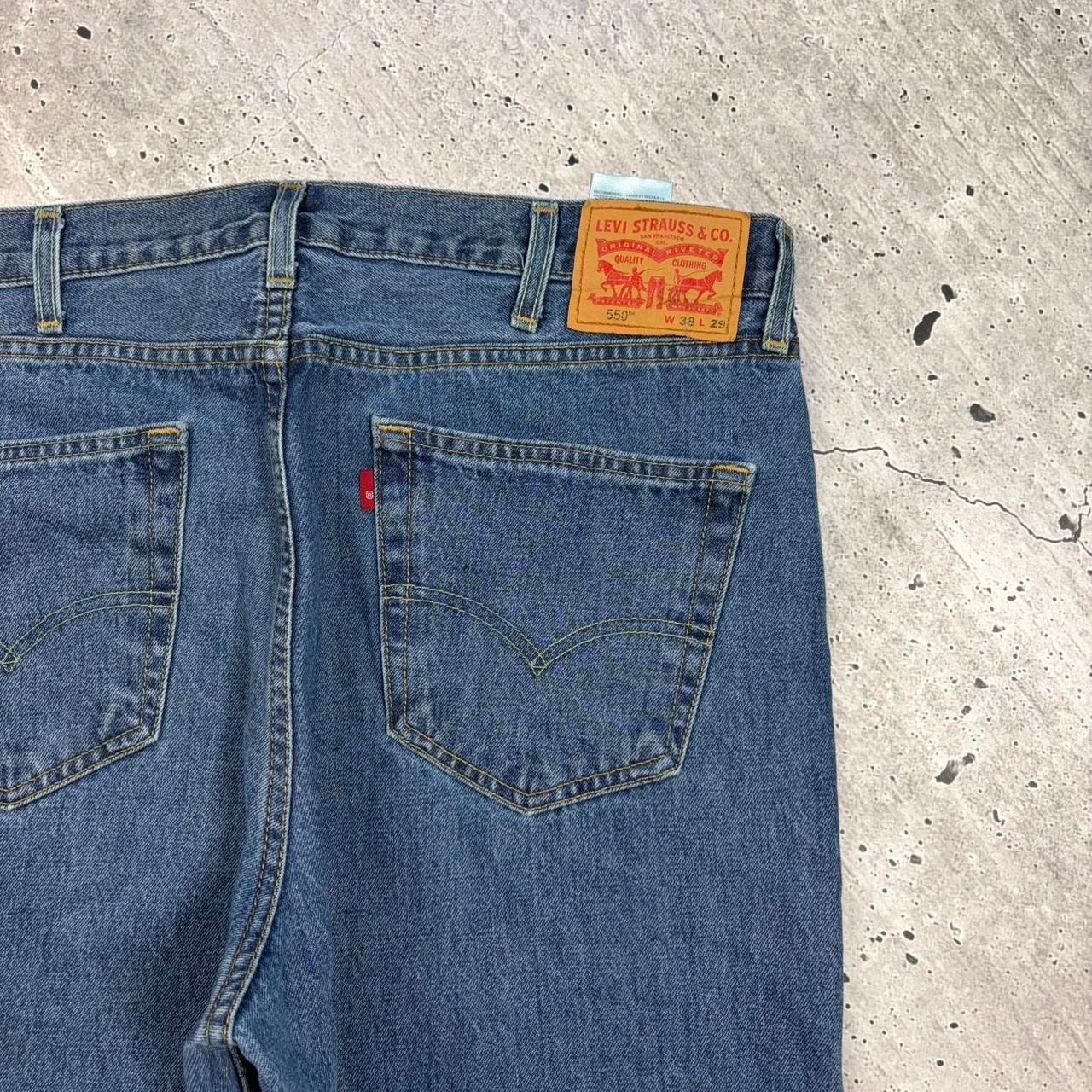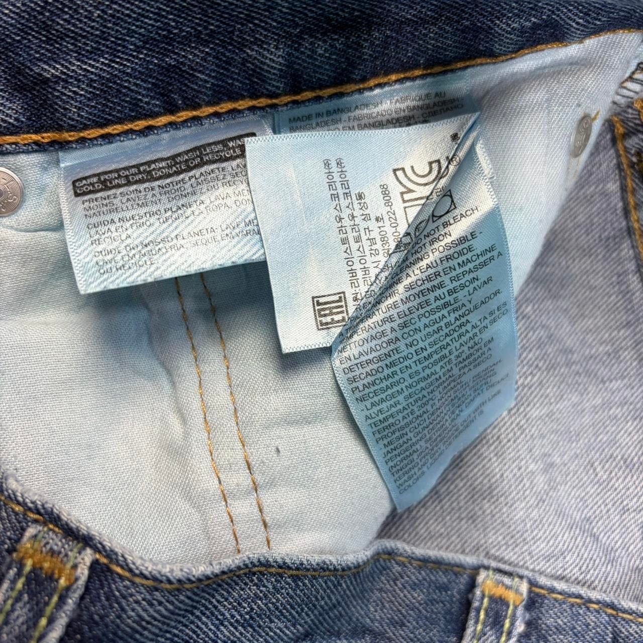 Blue Levi’s jeans with classic leather Levi’s logo patch on reverse.