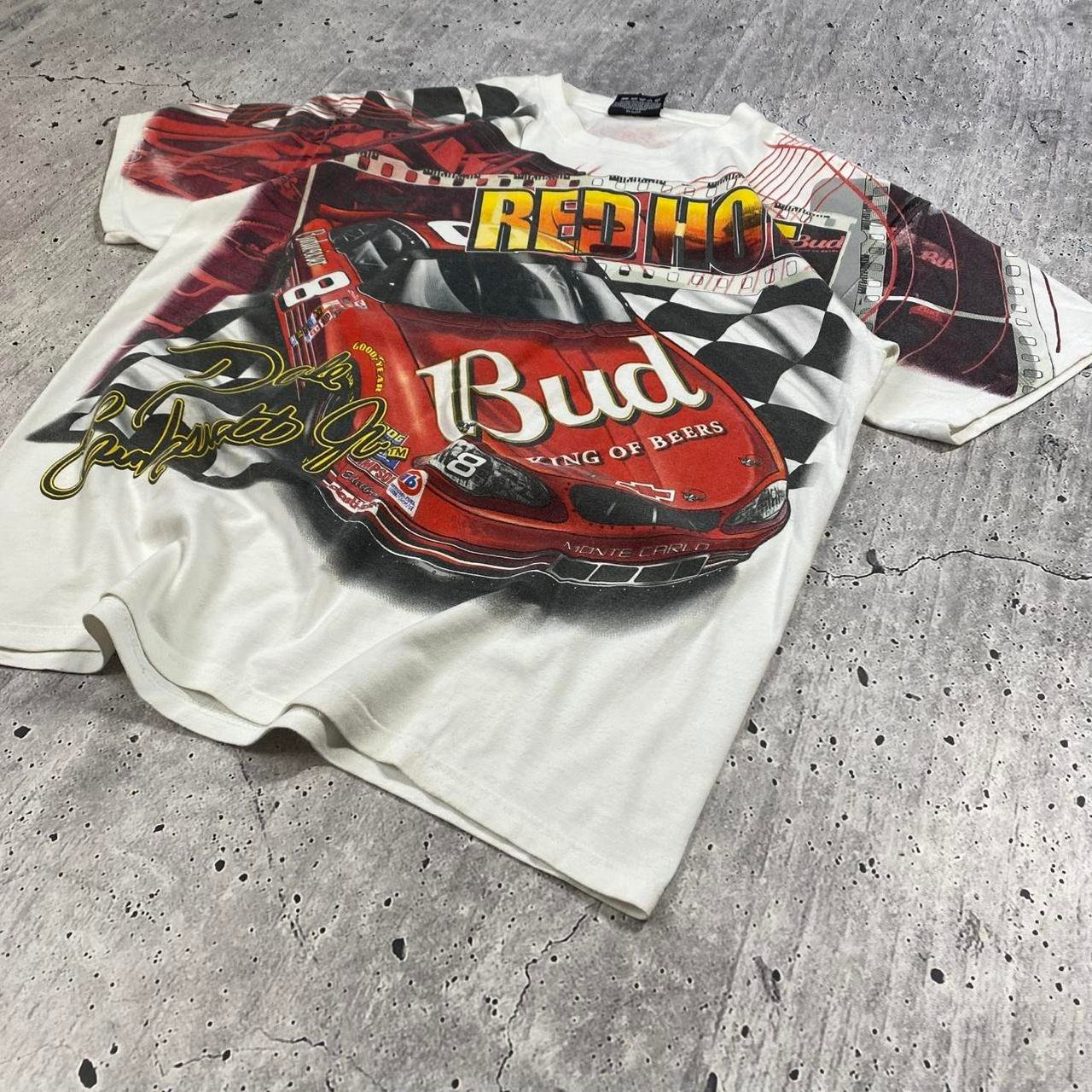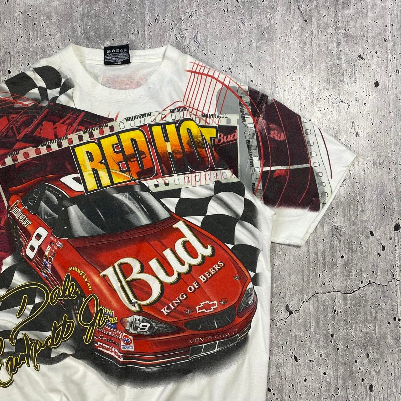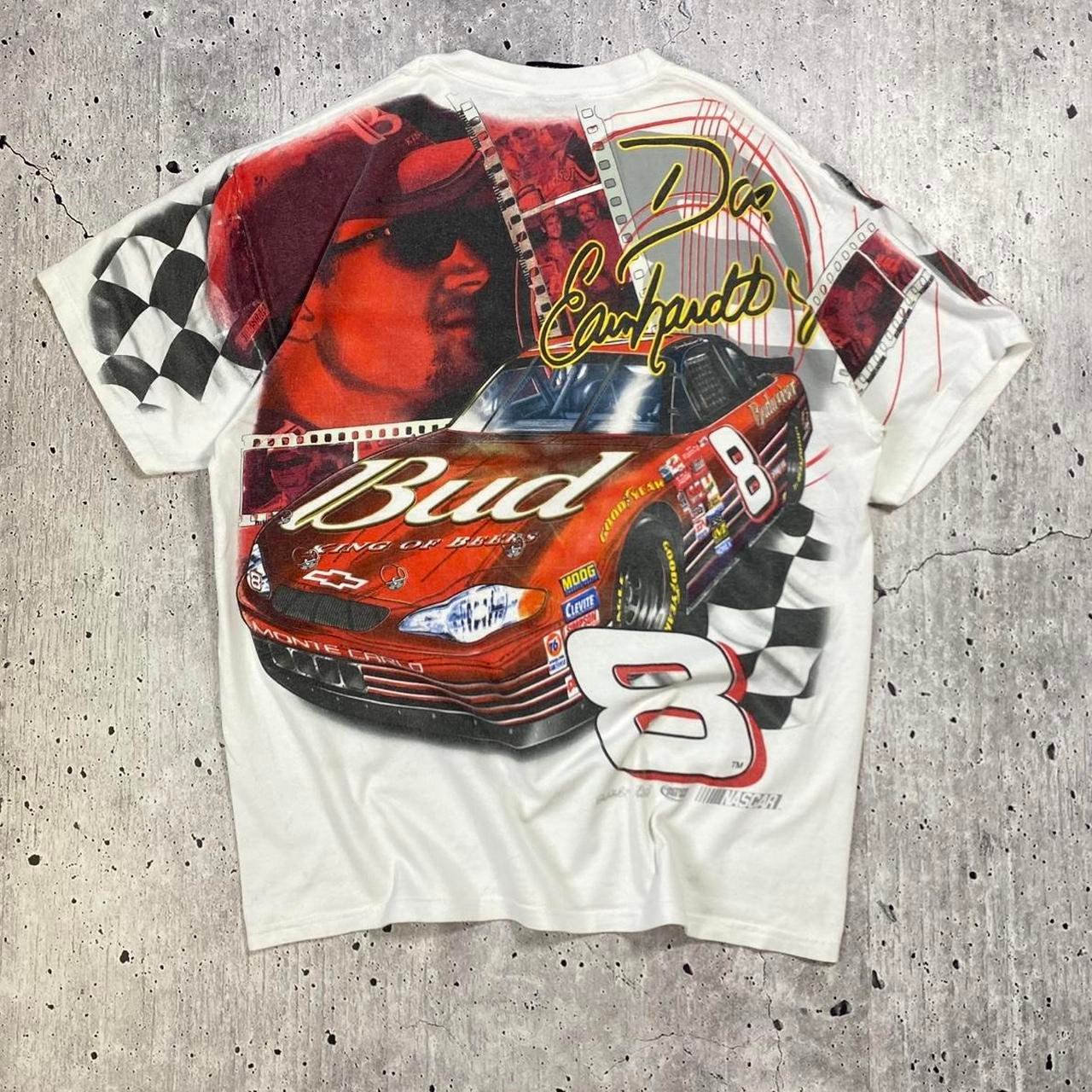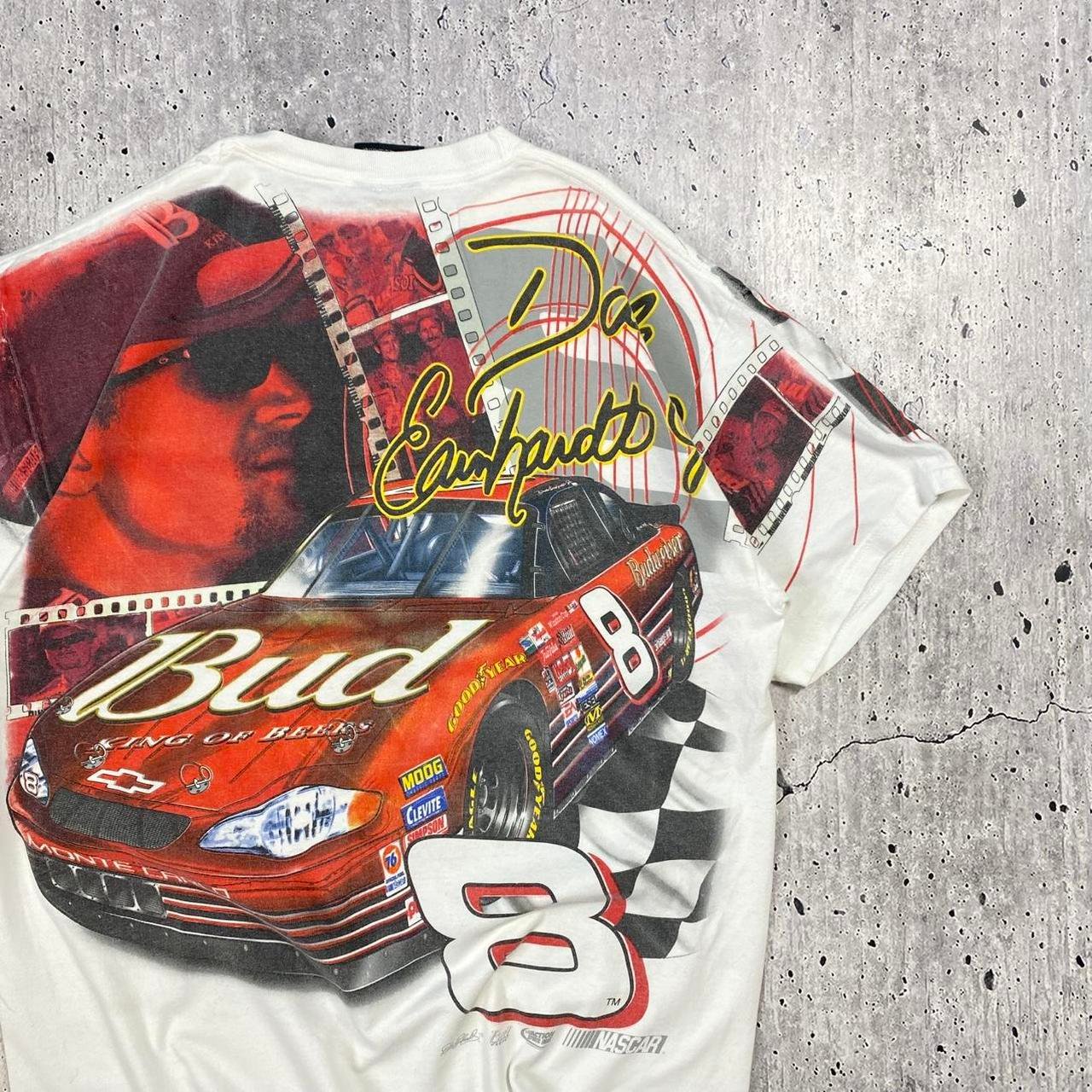 Vintage white NASCAR t-shirt with large printed NASCAR Budweiser racing car graphic on front and reverse.