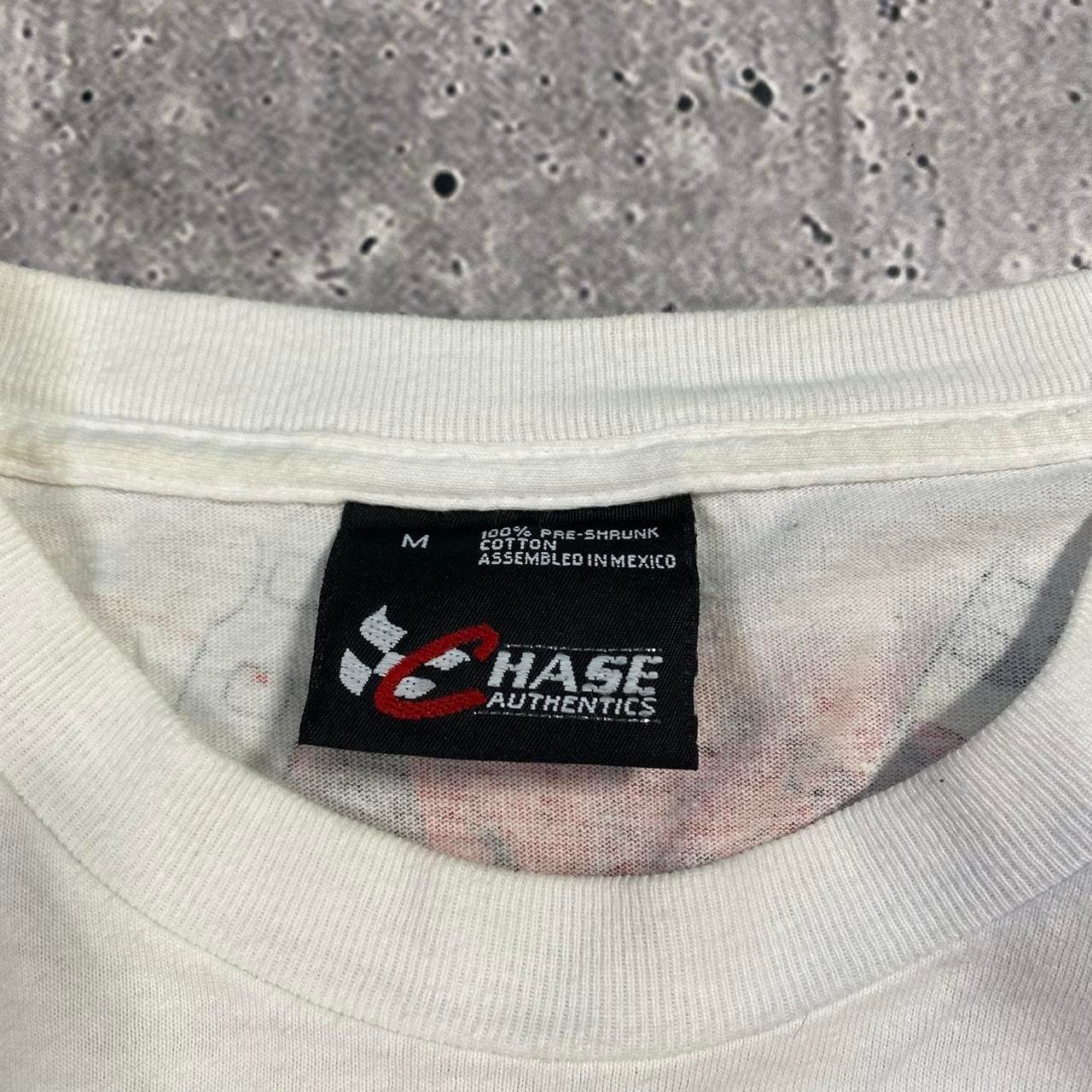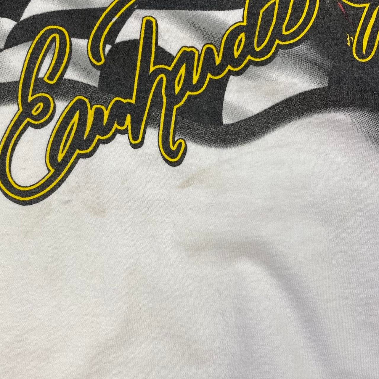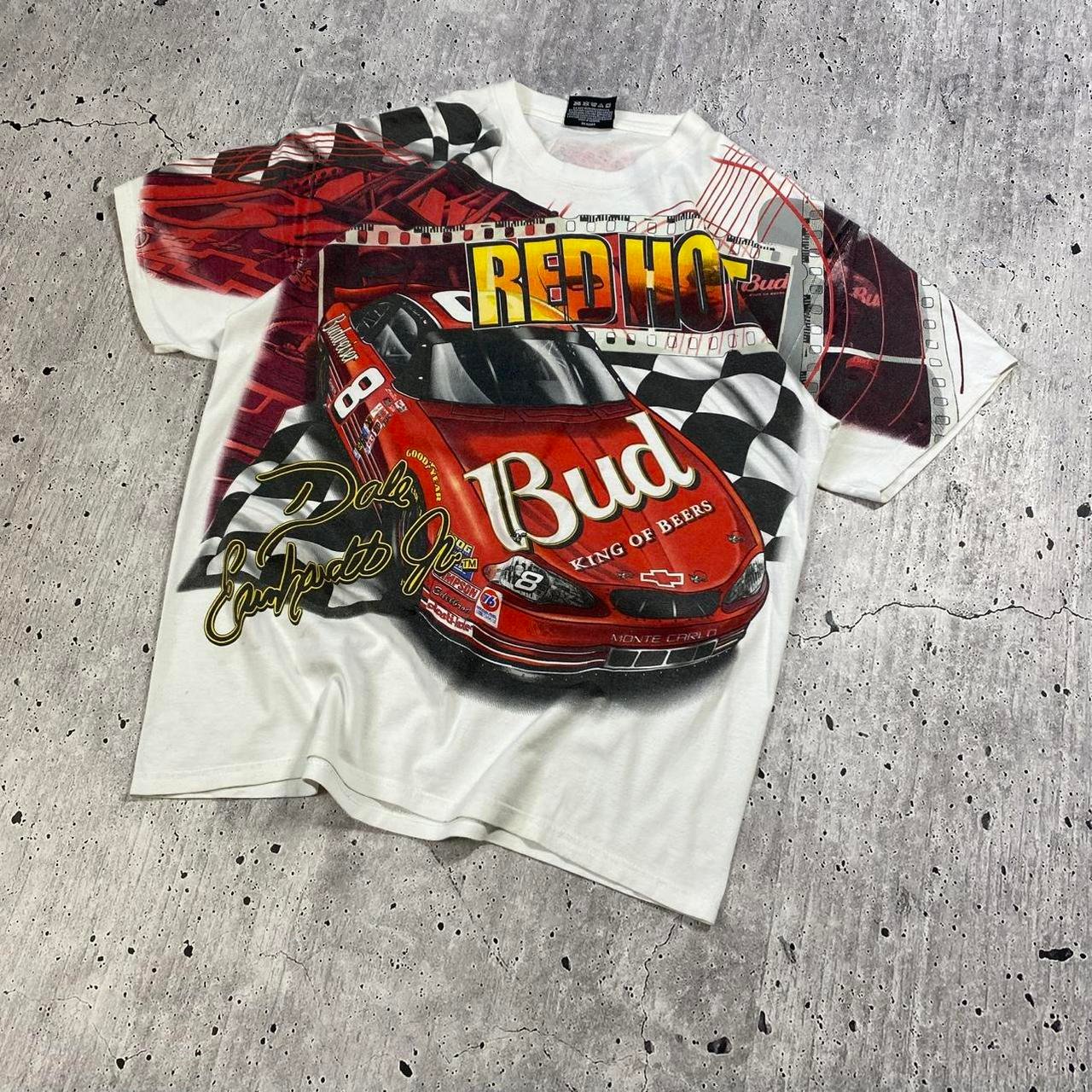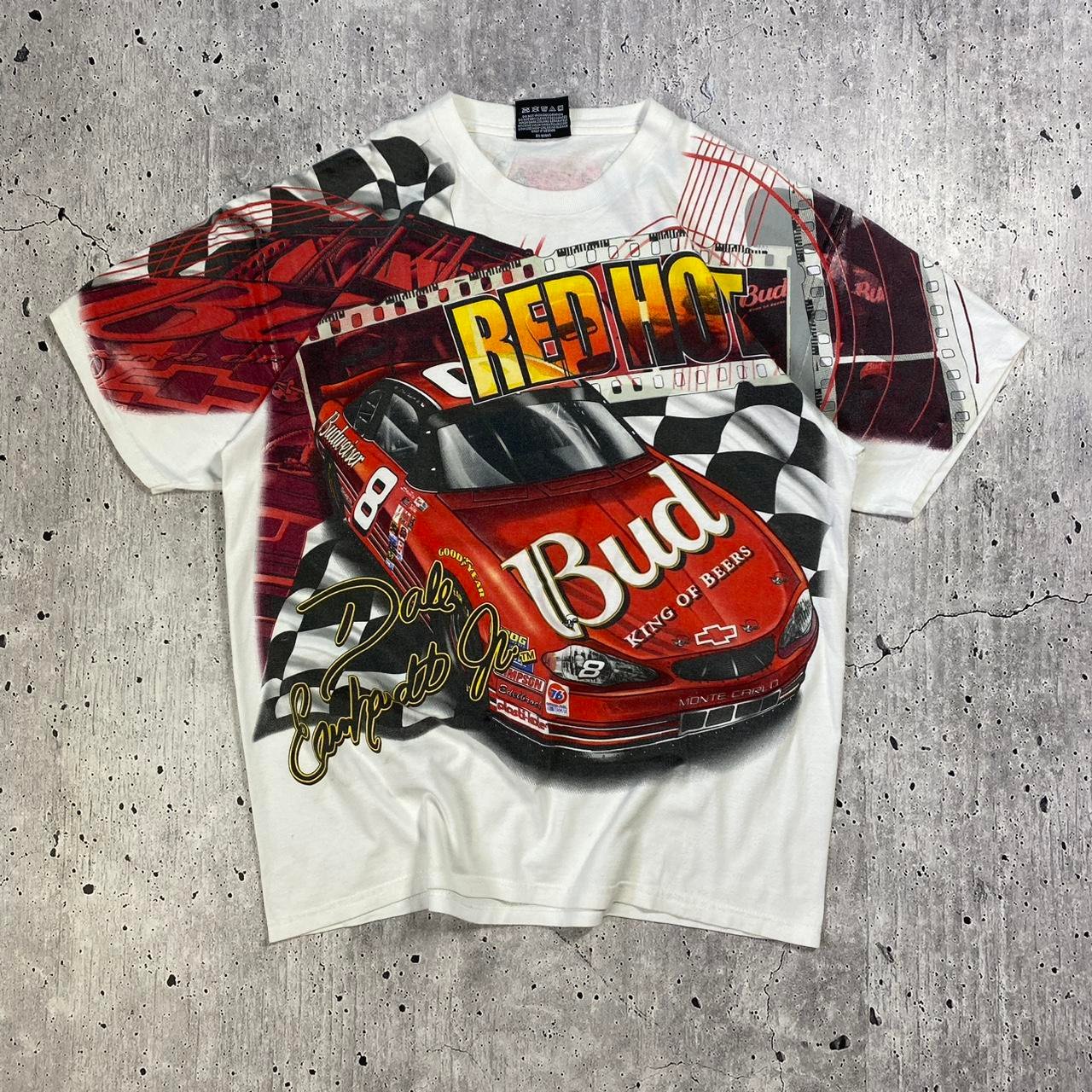 Vintage white NASCAR t-shirt with large printed NASCAR Budweiser racing car graphic on front and reverse.