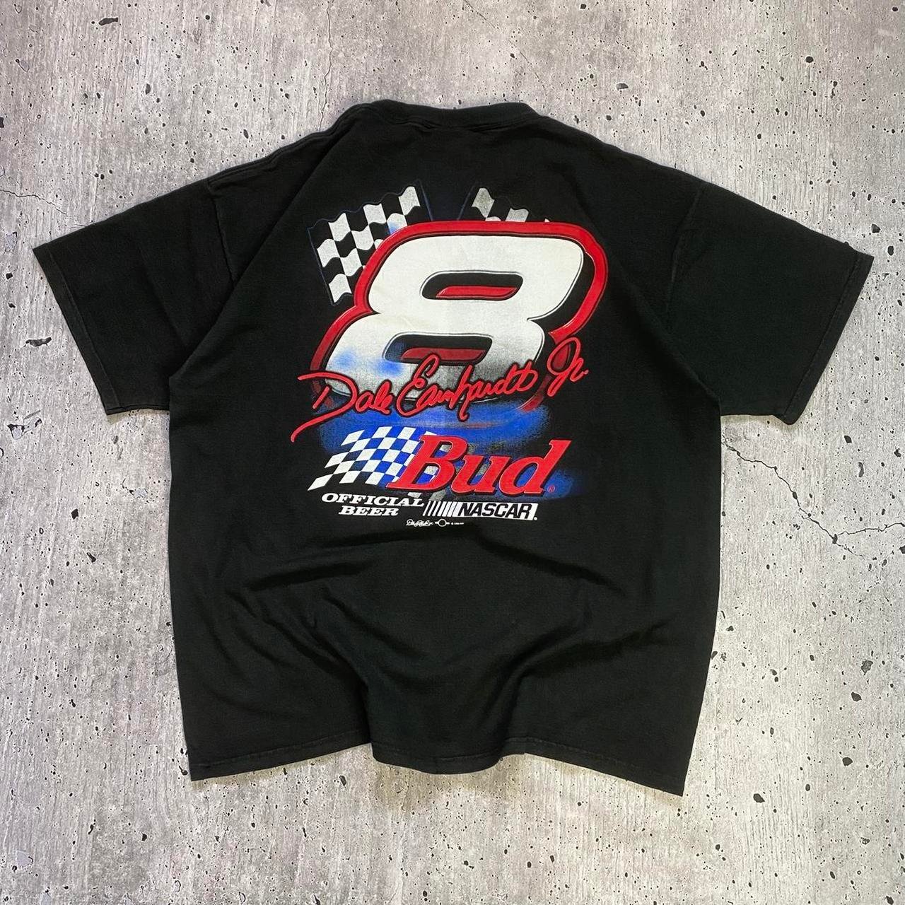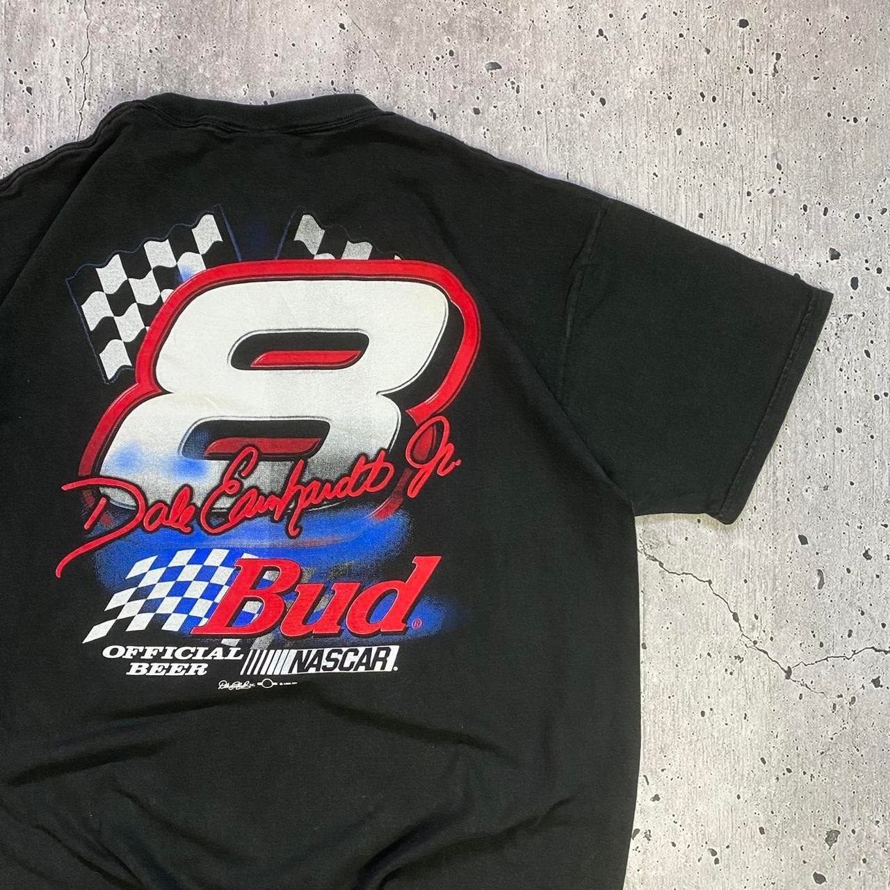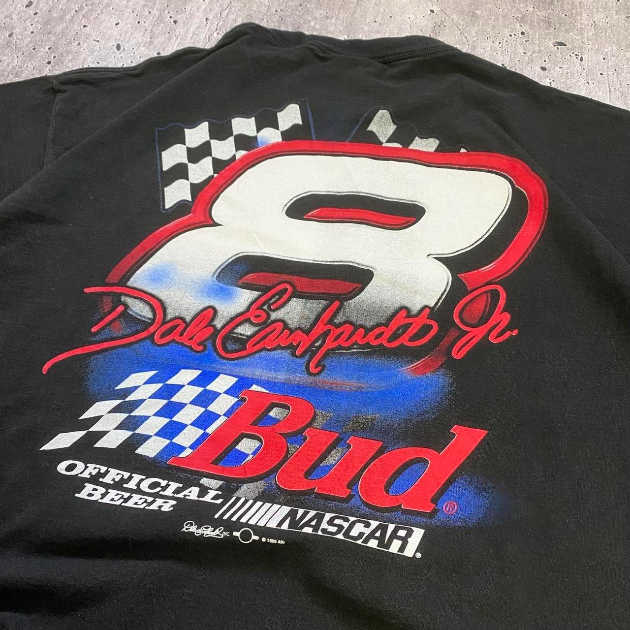 Vintage black NASCAR t-shirt with large double-sided Dale Earnhardt Jr Nascar Budweiser racing car graphic.