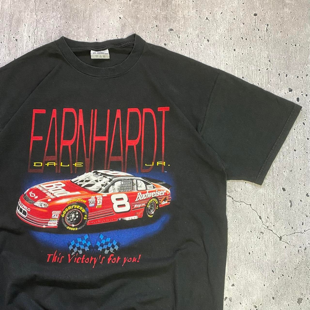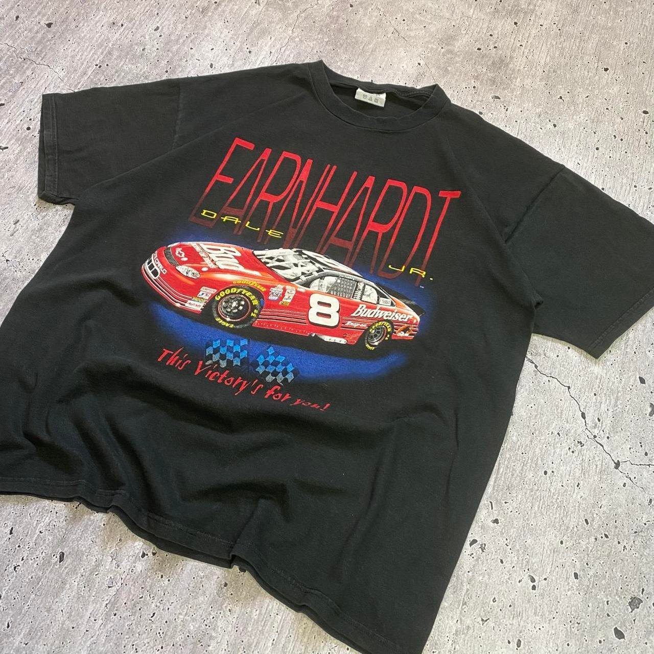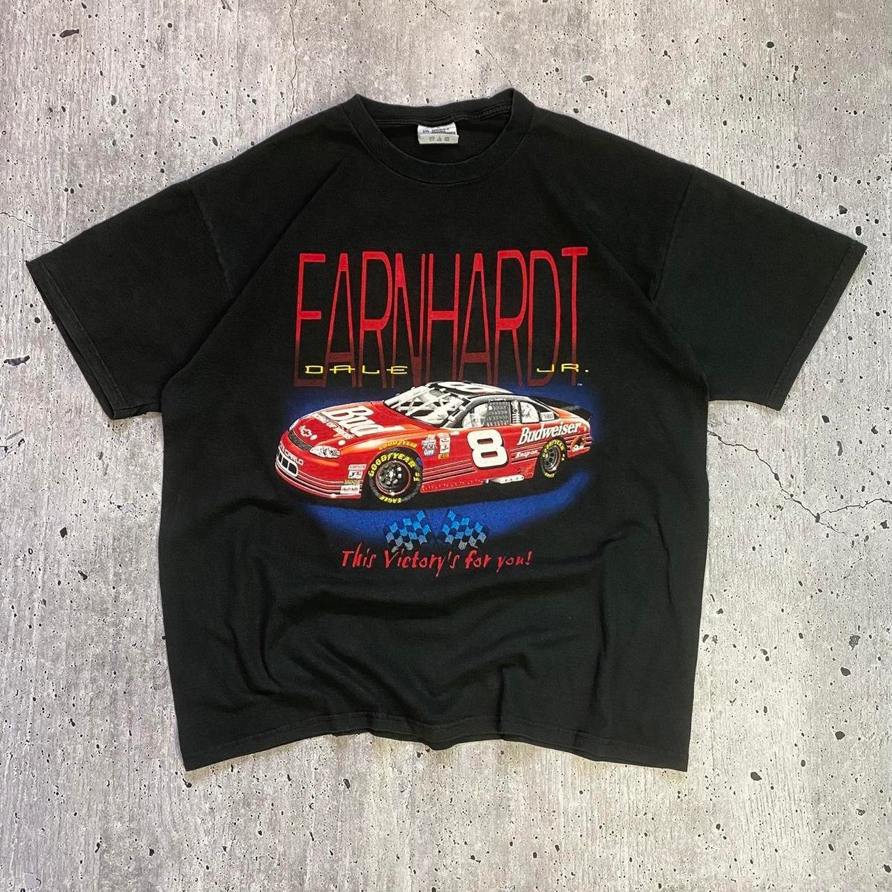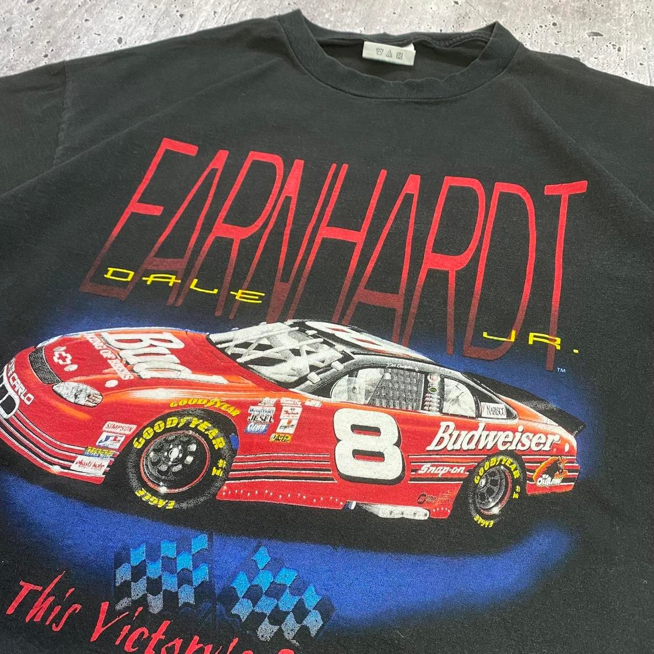 Vintage black NASCAR t-shirt with large double-sided Dale Earnhardt Jr Nascar Budweiser racing car graphic.