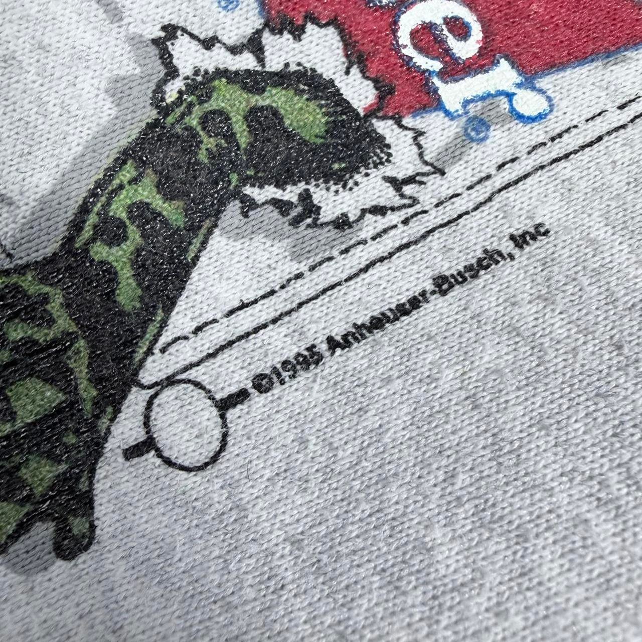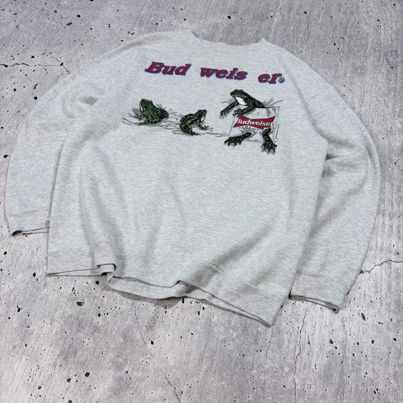 Vintage 90s light grey Budweiser beer sweatshirt with large printed Budweiser beer frog graphic on front and reverse.
