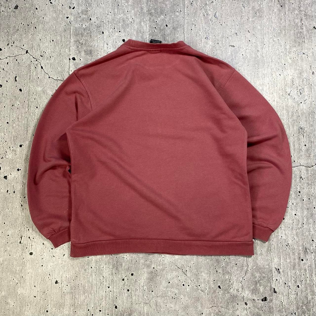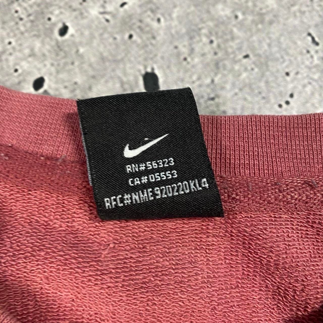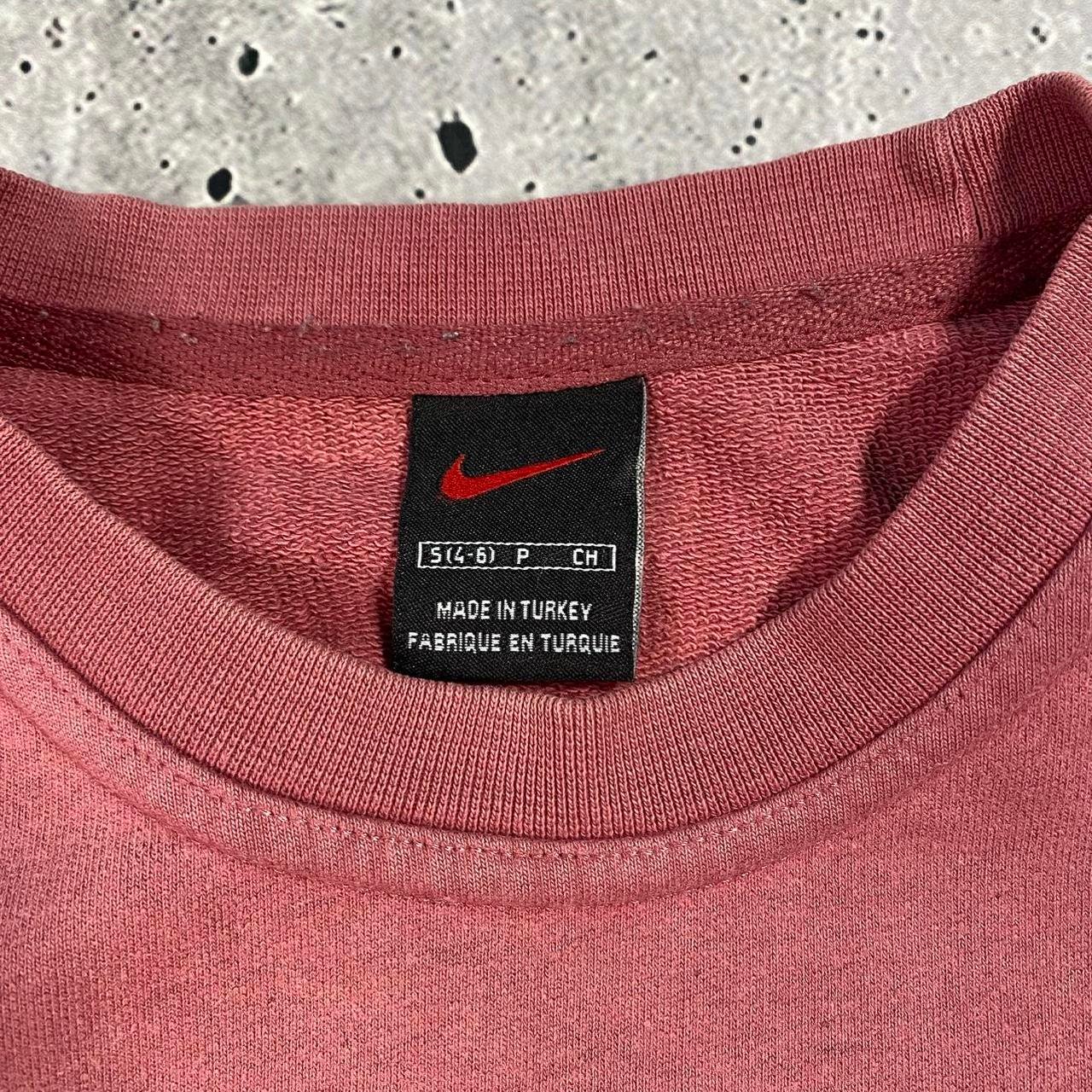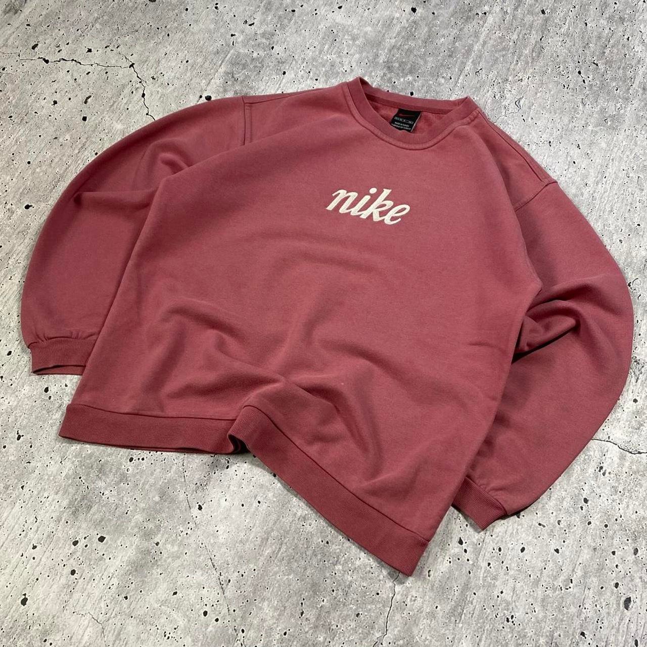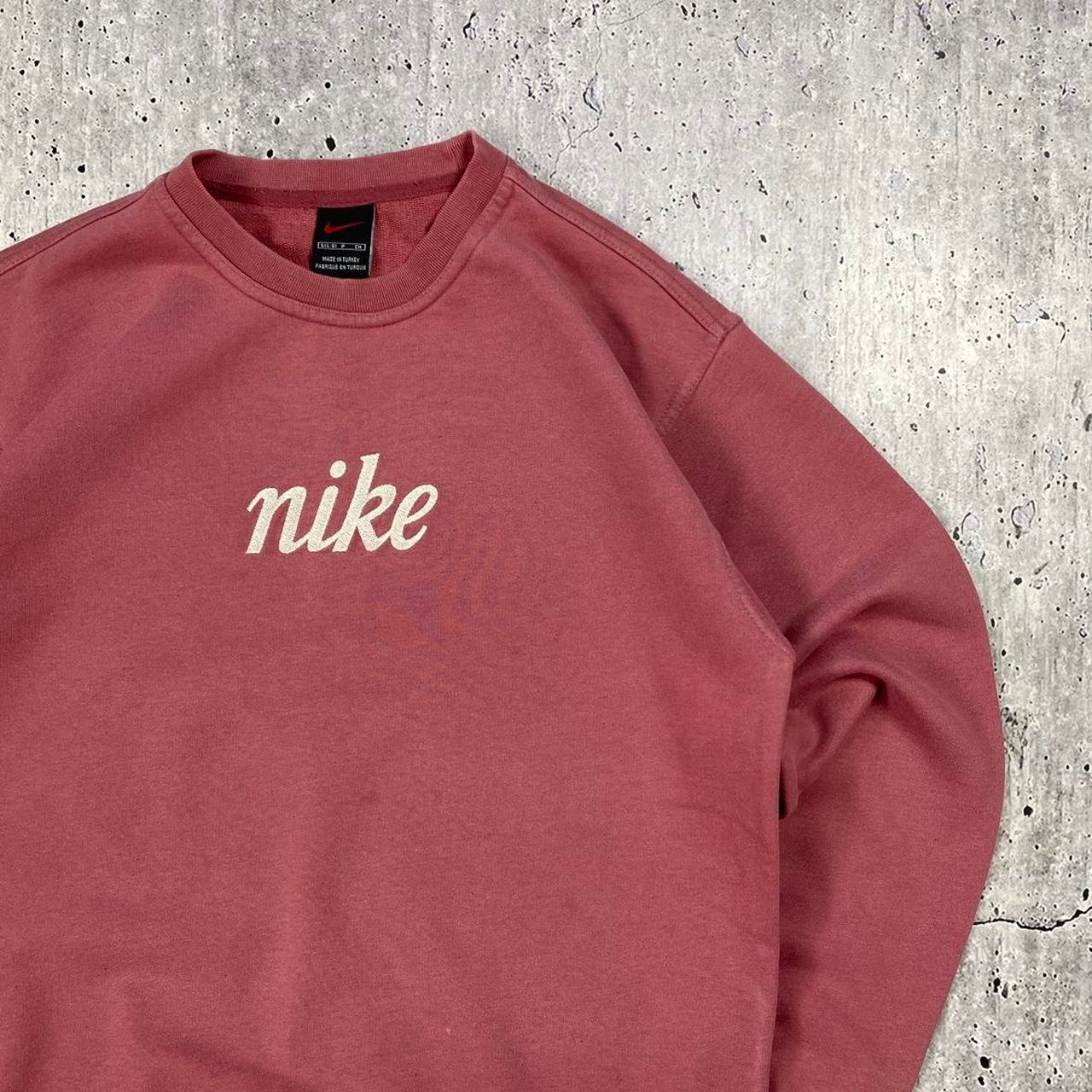 Vintage 90s pink Nike sweatshirt with large embroidered Nike spellout logo on chest.