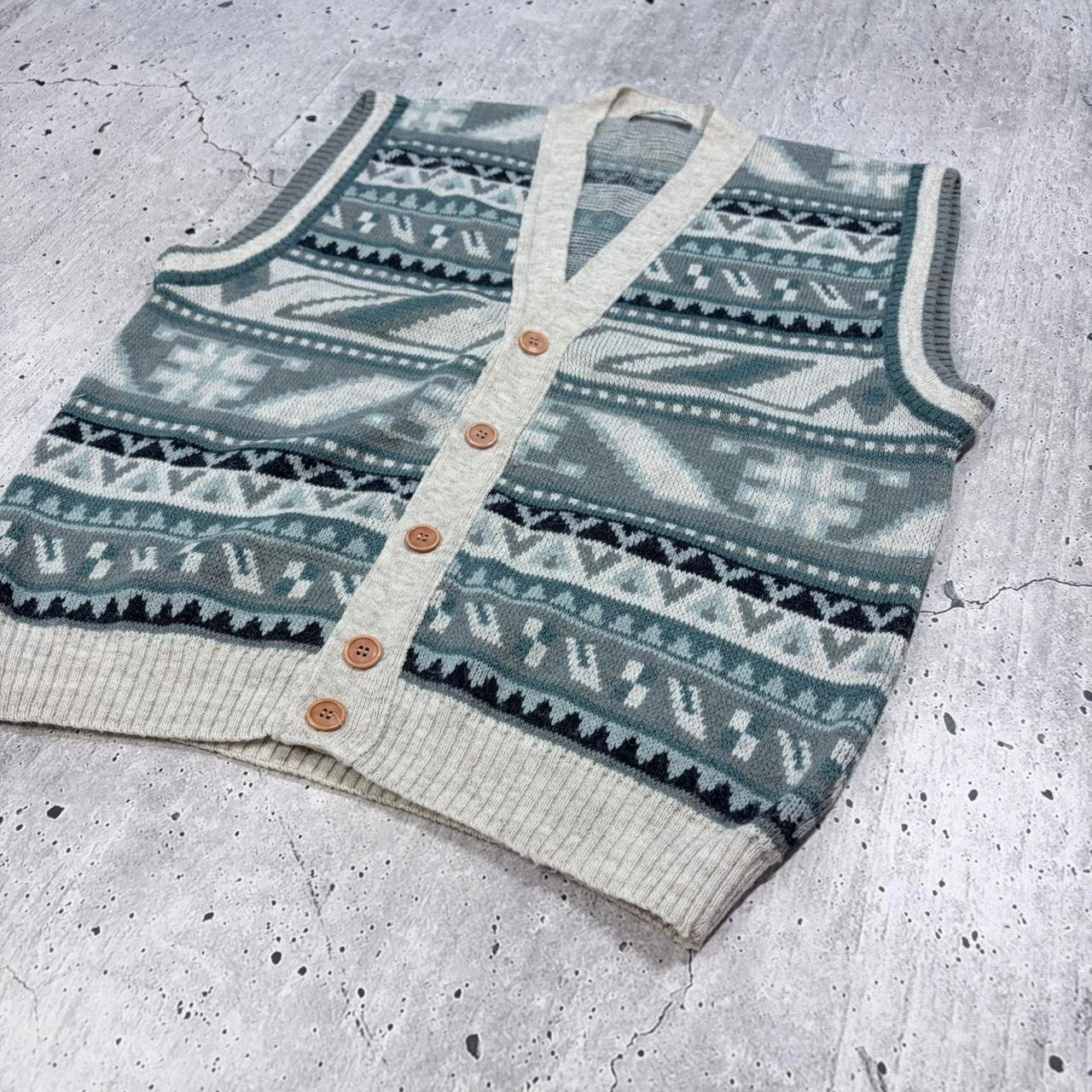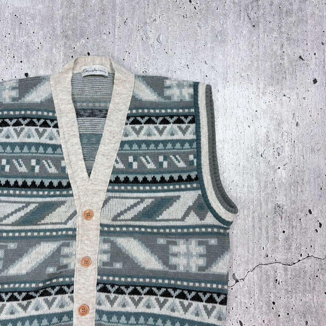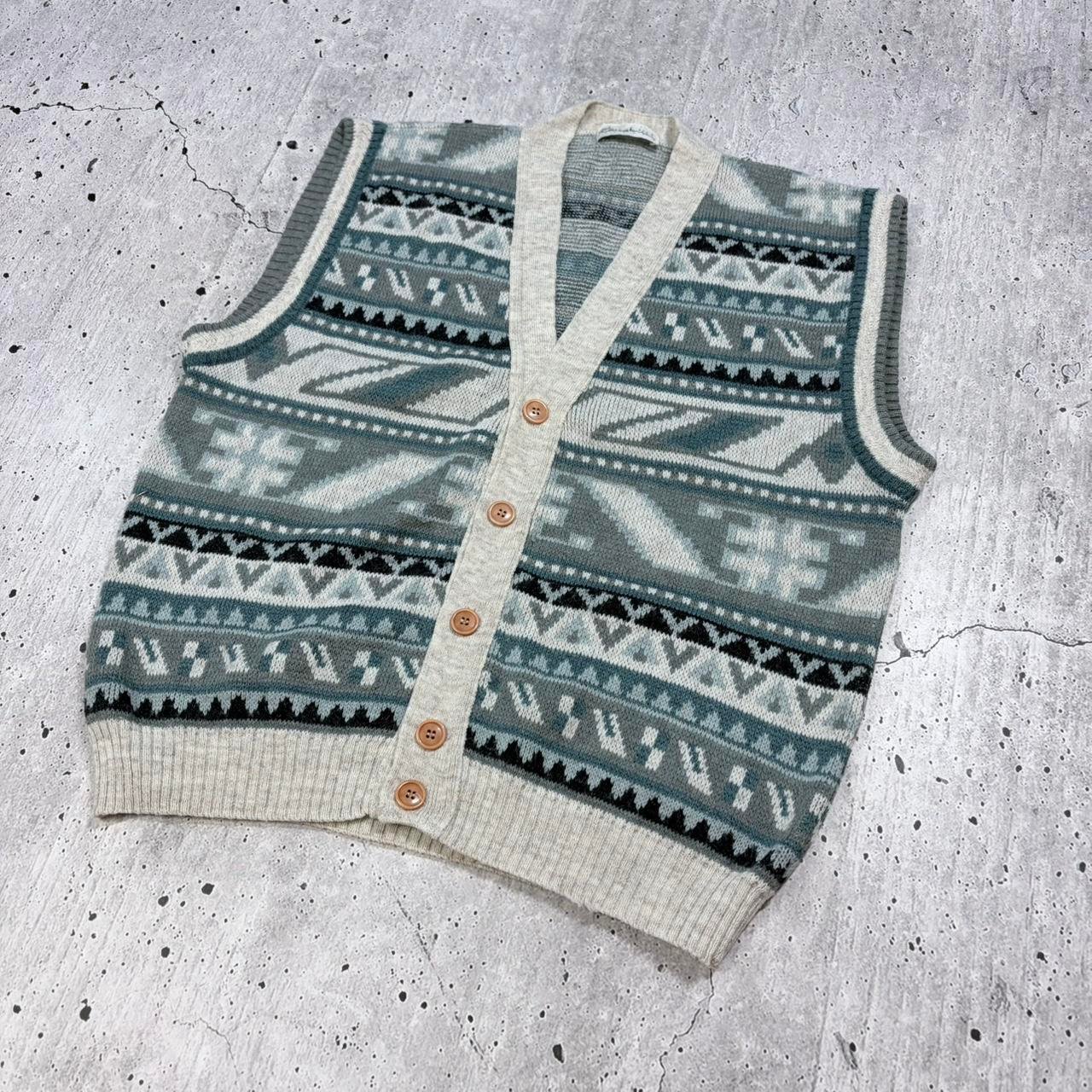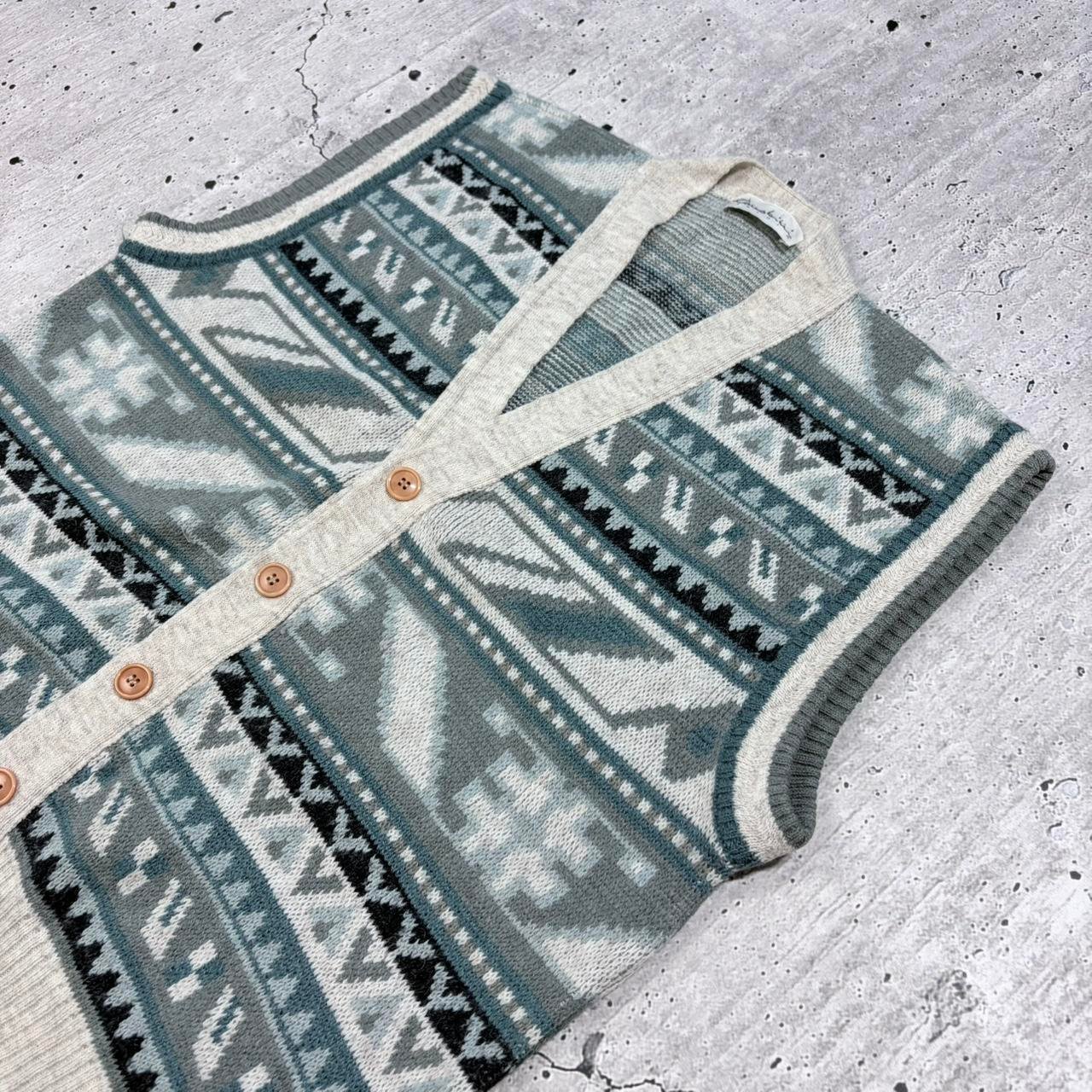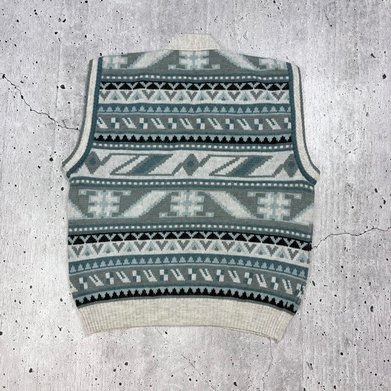Vintage 90s blue pattern knit sweater vest with button-up fasten. Heavy quality knitwear.