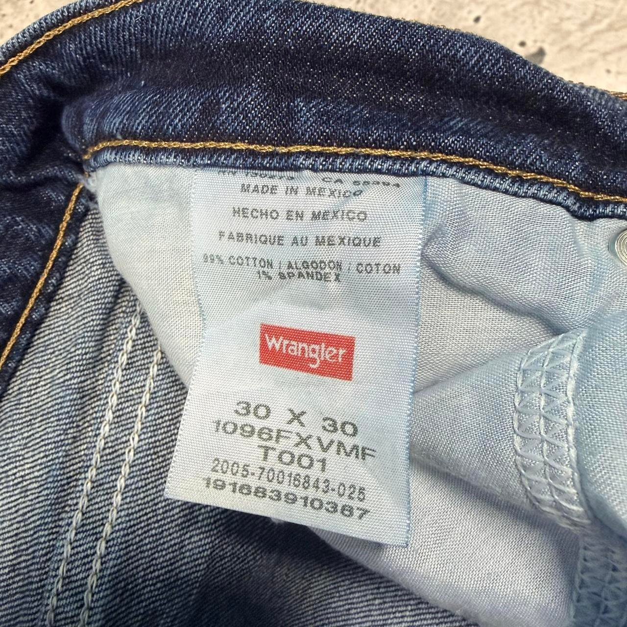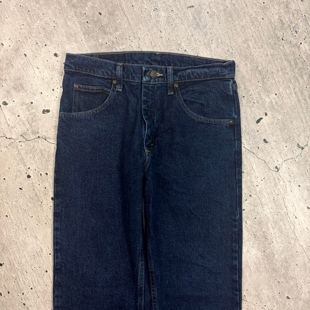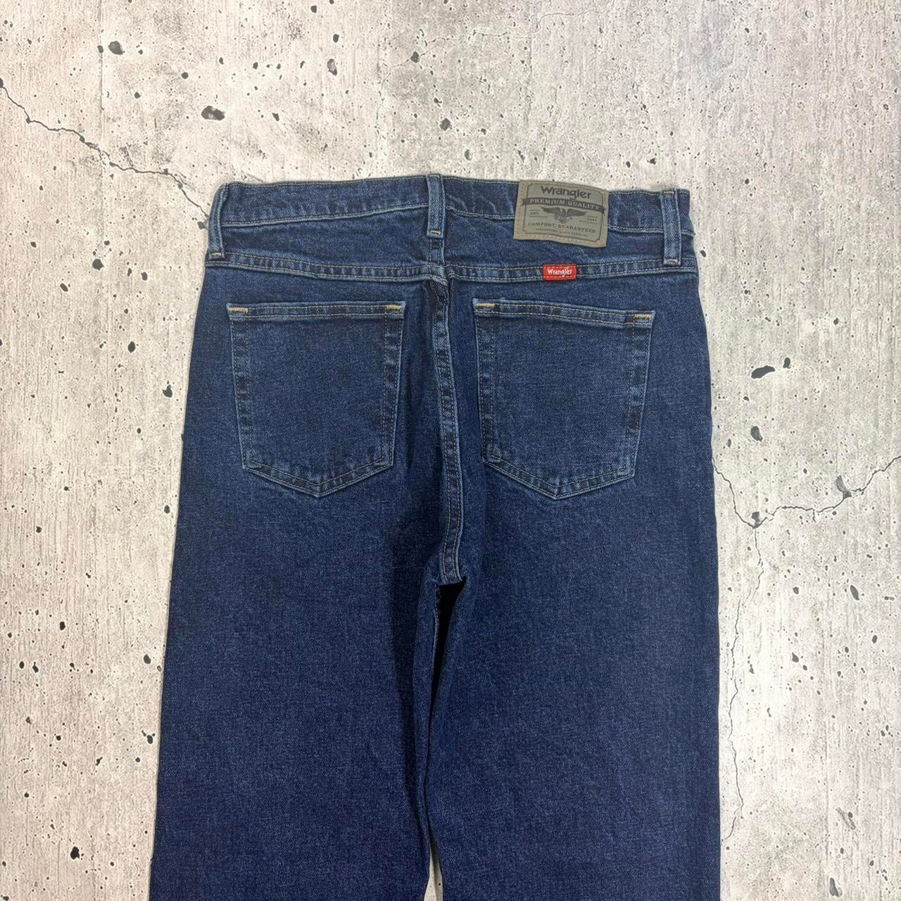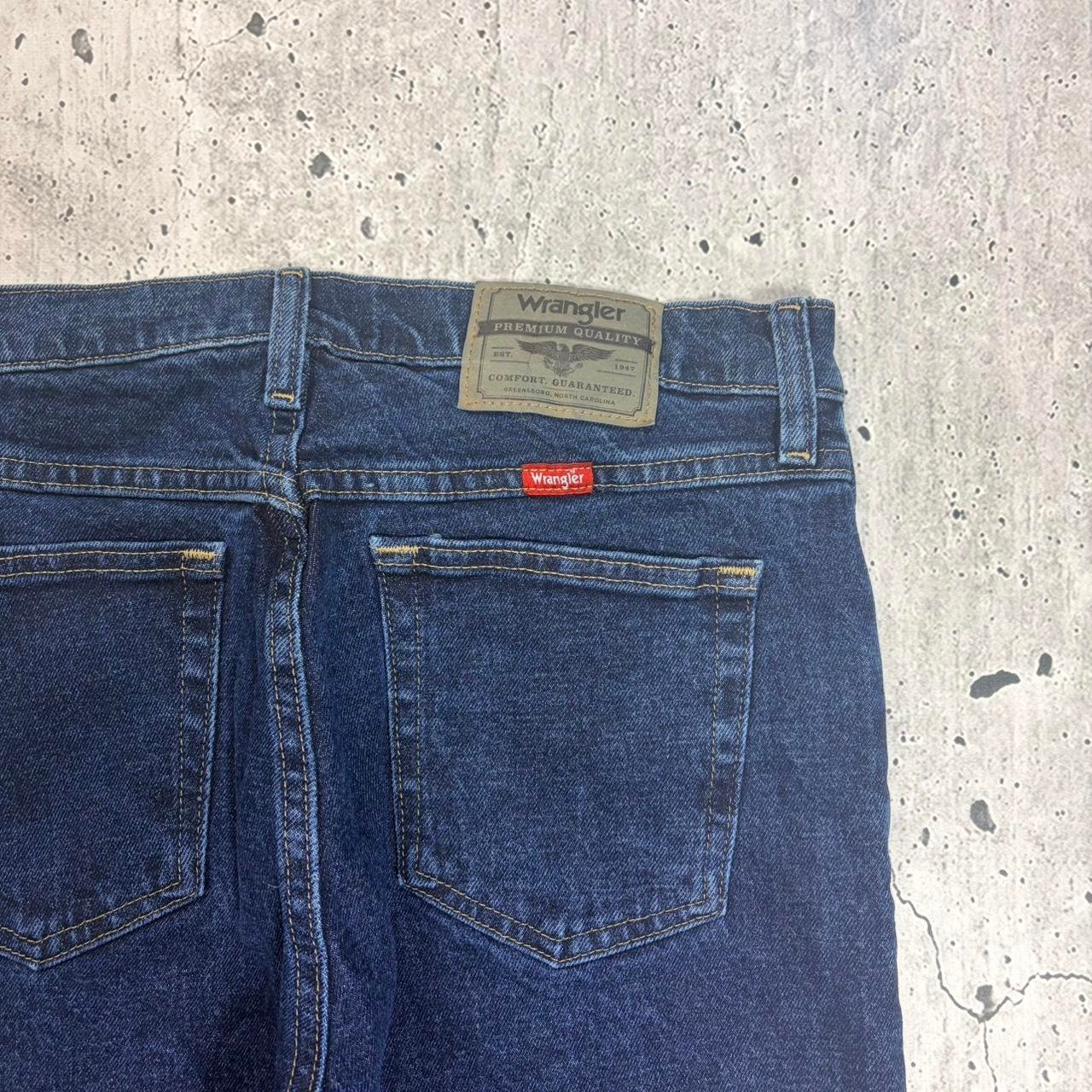 Dark blue Wrangler straight leg jeans with leather Wrangler logo patch on reverse.